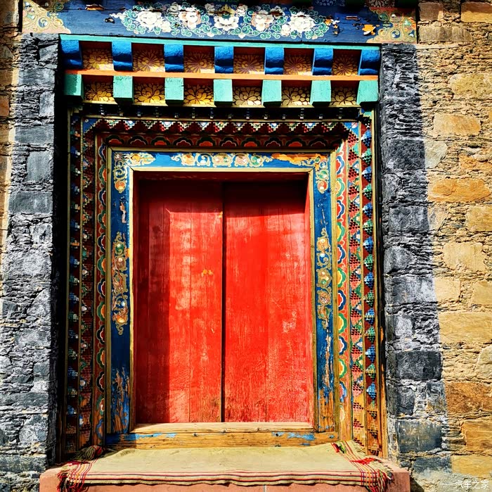 木里 大寺的建材以土木为主,式样显唐明风格。院落重叠,回廊曲栏,错落有致,门厅壁柱、绘有各种彩绘壁画、图案,金碧辉煌