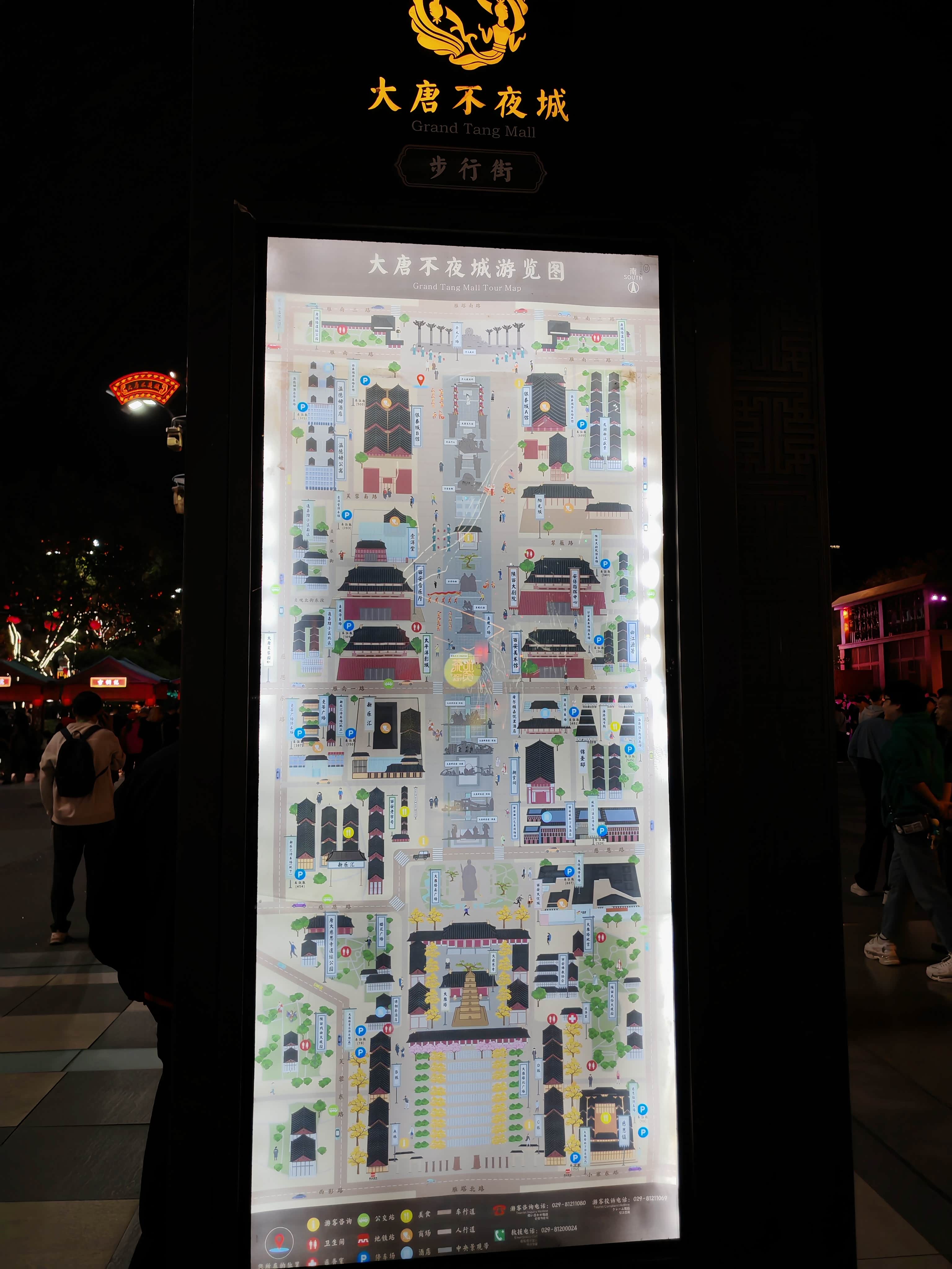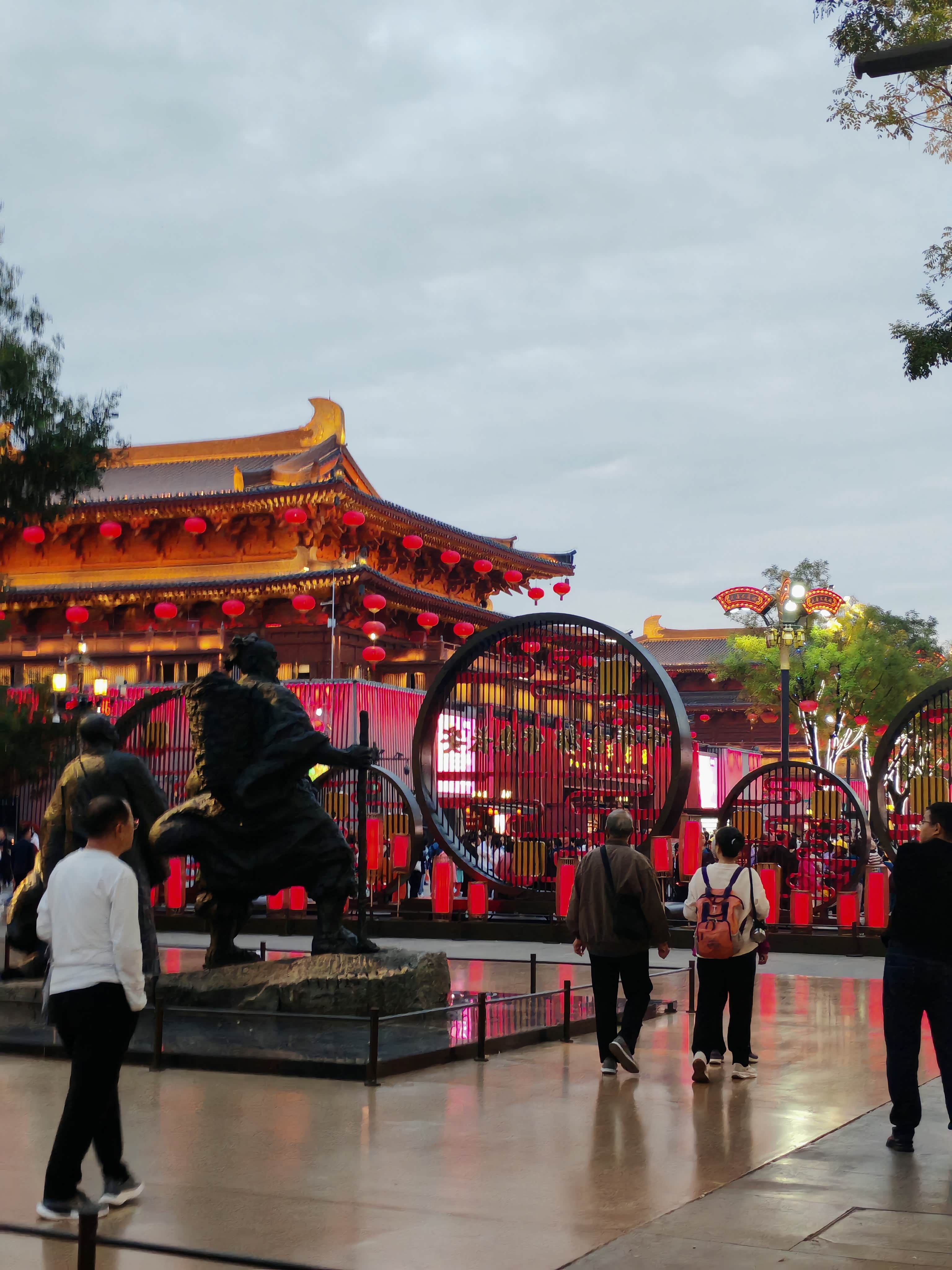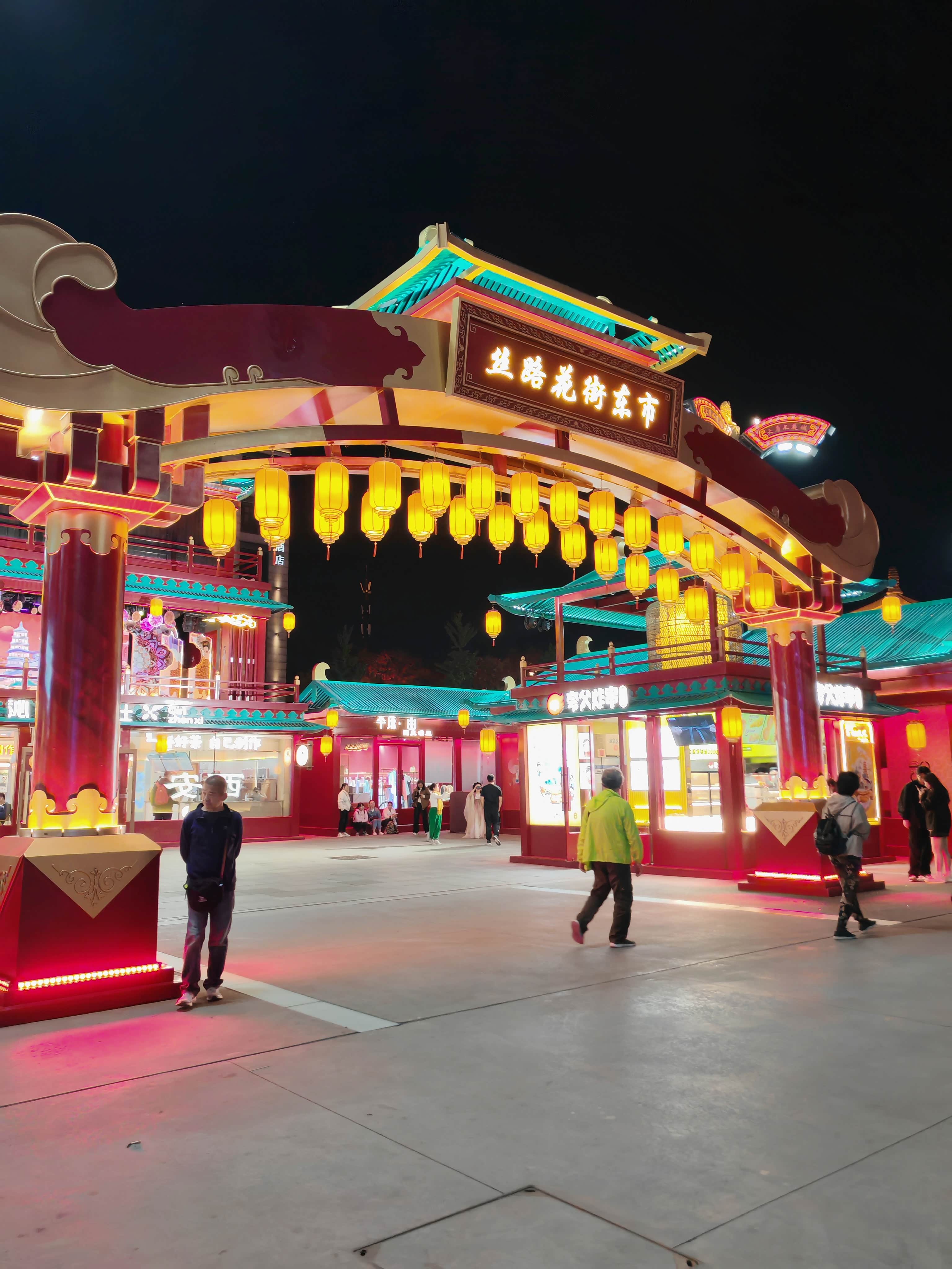 大唐不夜城其实是条露天步行街,大概有两公里长,24小时开放街区,但白天平平无奇,晚上开灯后才有大唐盛世既视感