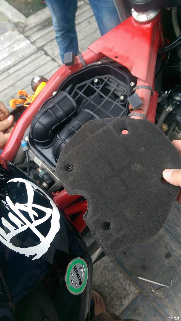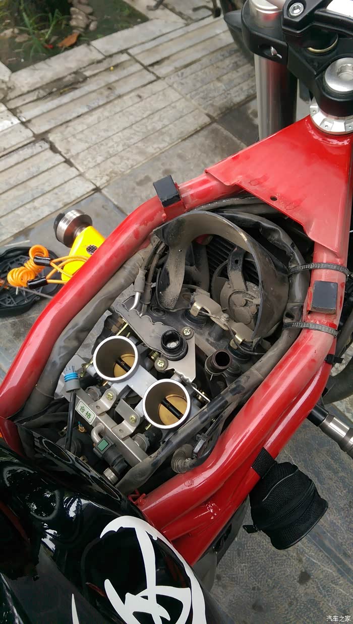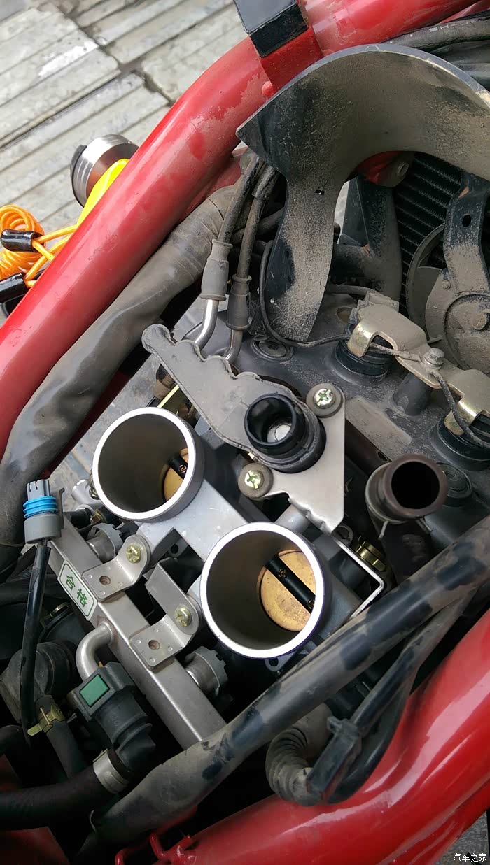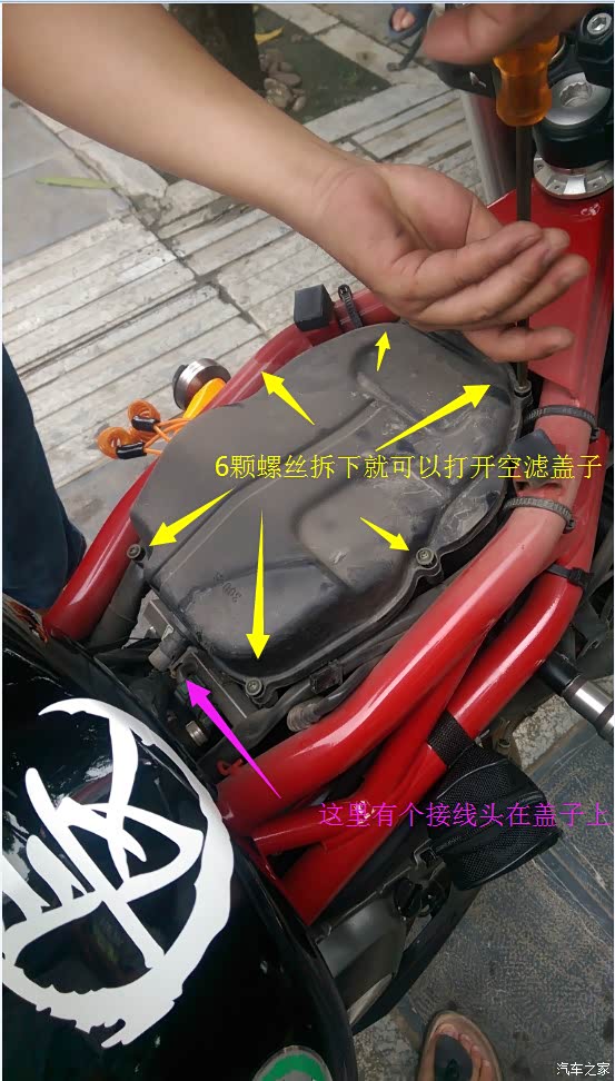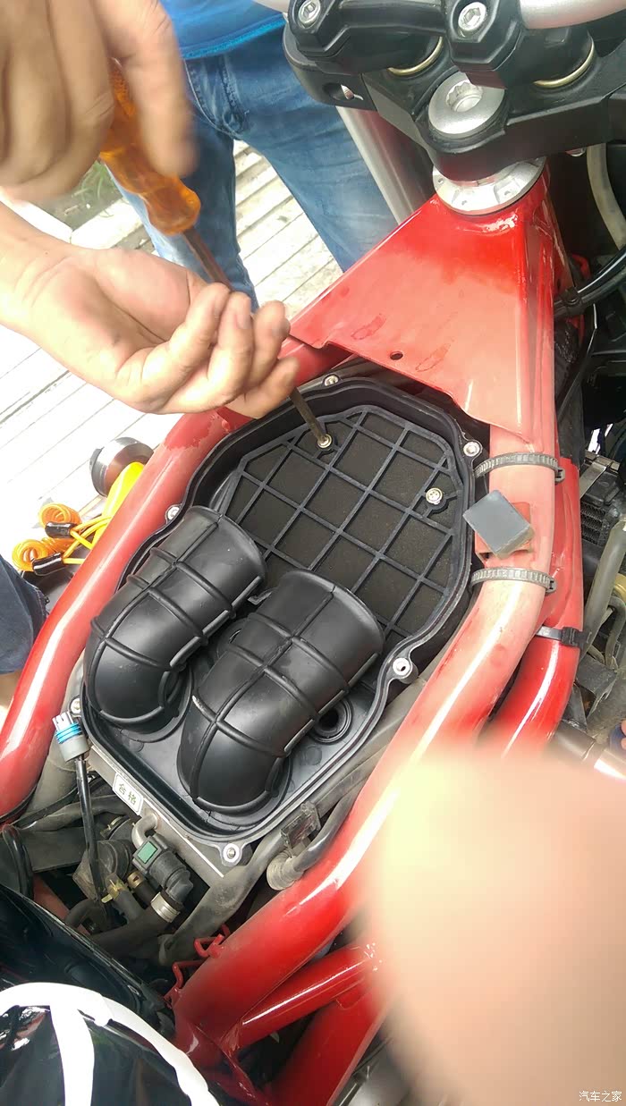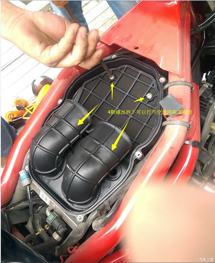 今天补充下 漏了关键一步....那两个吸气管口的下方 分别都有扎套扎住下面的气门口的,需要用夹子取下扎套,这样才能取下空滤盒子》。。。