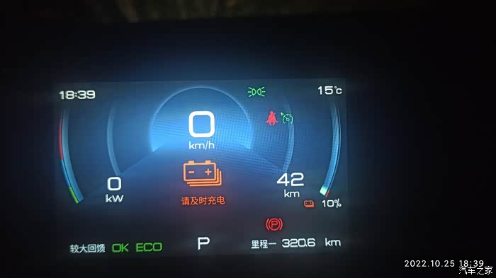 如果百公里电耗10度左右,到剩余电量接近15%的时候基本上也就能跑300公里,为什么强调15%呢,因为今天跑到10%(屏幕提示请及时充电)之后预约充电,发现预约充电也是有限制的,只要电量低于15%无论怎么预约,都是插上枪就充,屏幕提示车辆电量过低,已经开始充电。