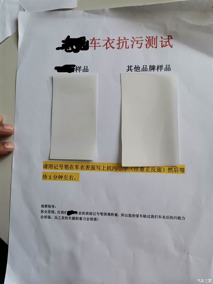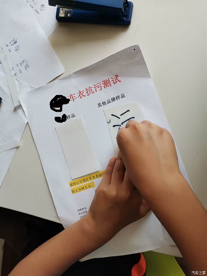 儿子在测试表面用油性记号笔(附着力很强)在车衣表面写字