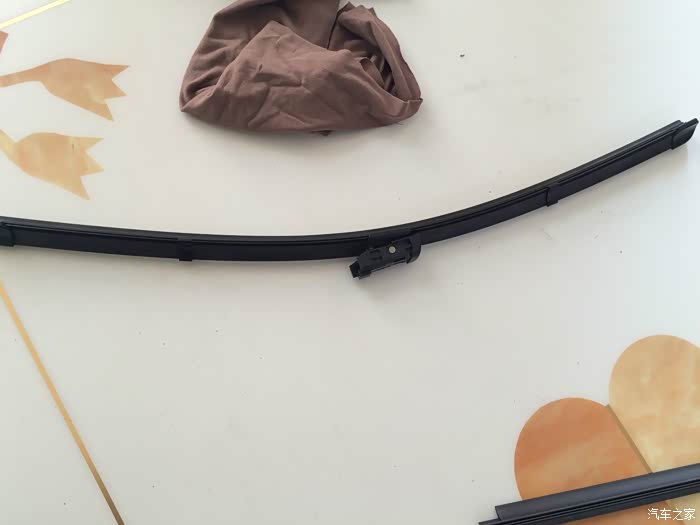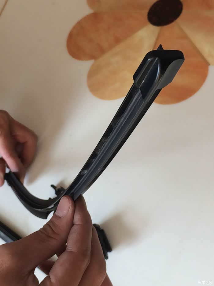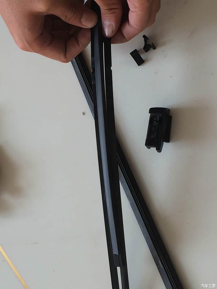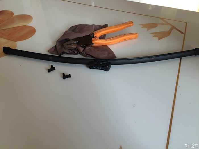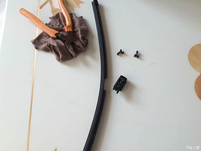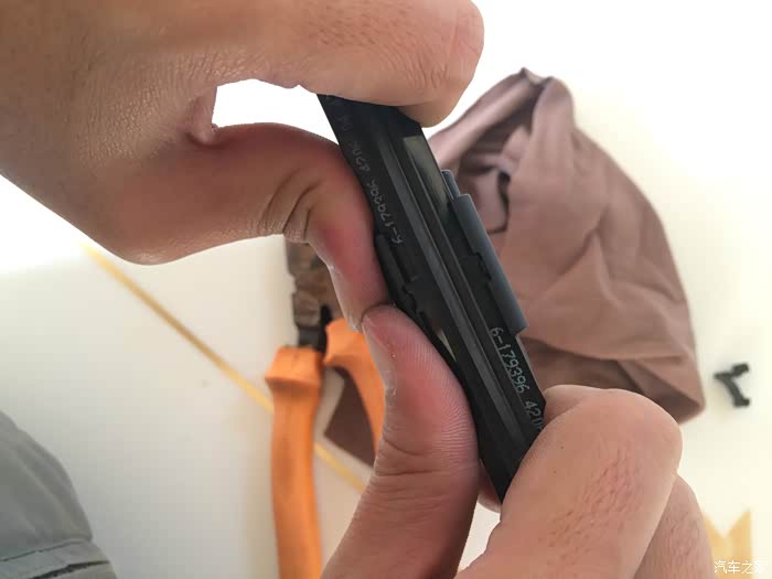 大家能看懂需要钳子跟抹布的原因了吧!我们原车雨刮器的扣子是用手不容易弯动的,用钳子的话就需要块抹布,原因是要保护一下钢片不掉颜色。弯的时候需要往外用力,看见雨刮器扣的点松动后,一下就能拿下来了。这个都是卖胶条的老板指导完成的,自己动手感觉还是挺有趣。