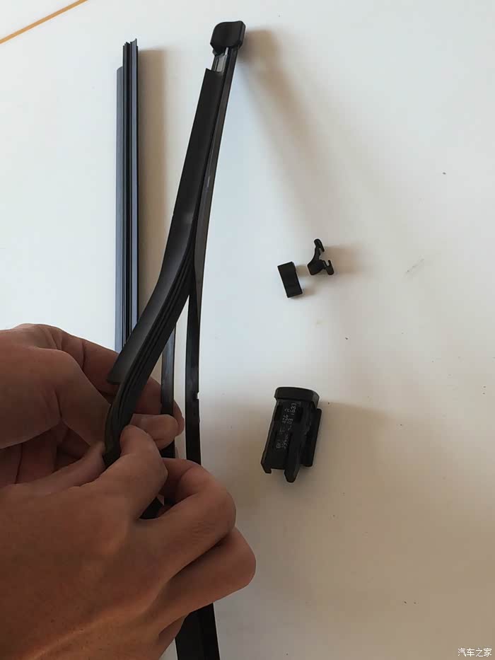 把胶条装好,就是把雨刮器扣子装上,要装到胶条中间那个凹槽里,要用两手往外推一下让雨刮器扣子的凸点卡到钢片上,基本要比拆下来的时候简单多了。