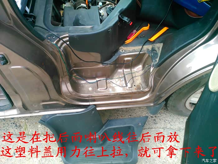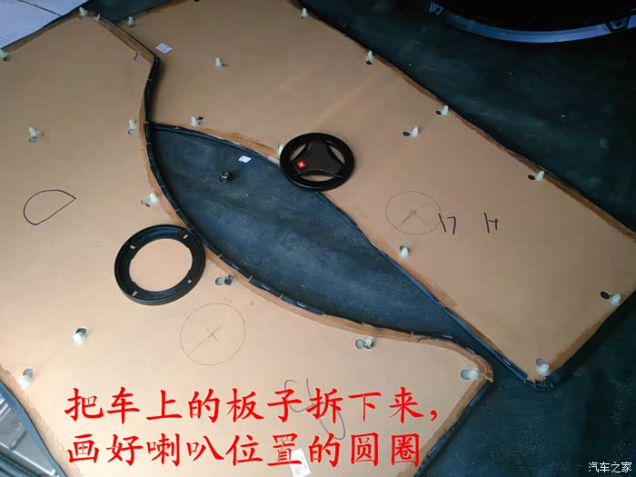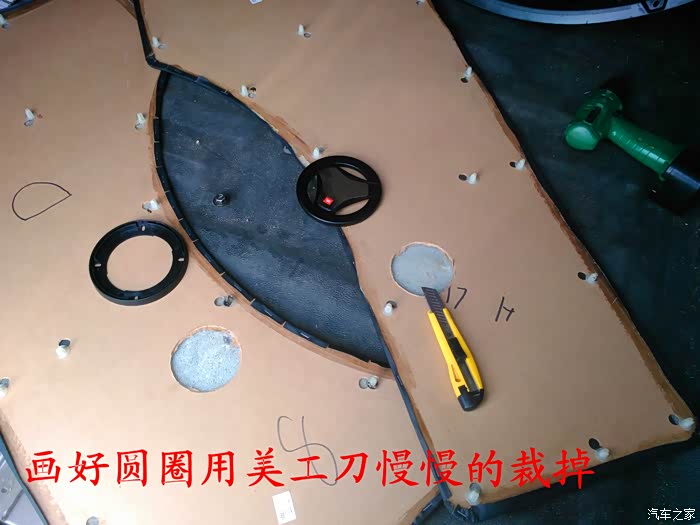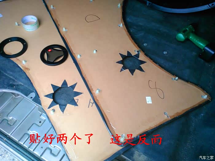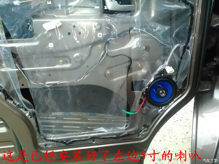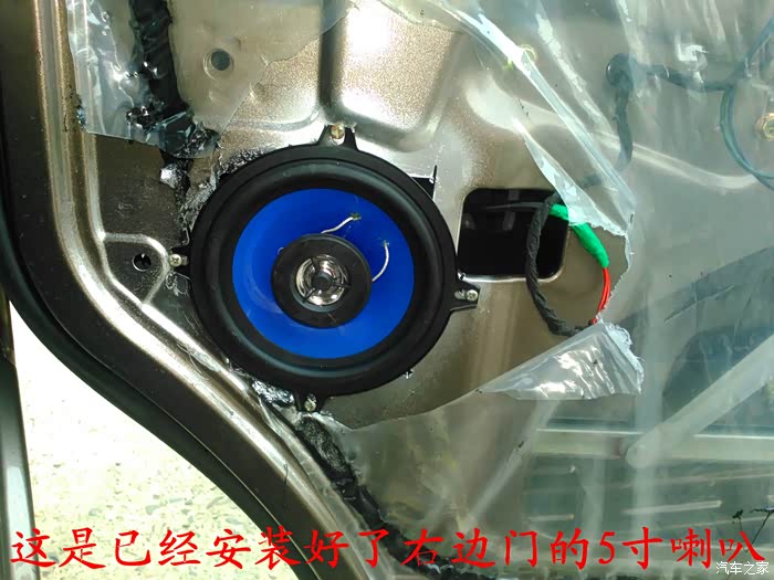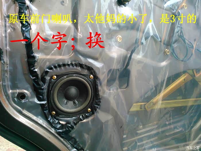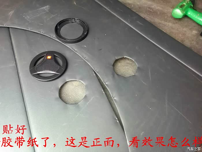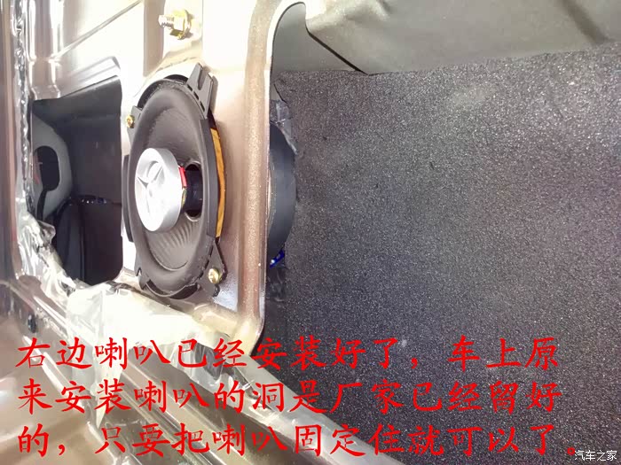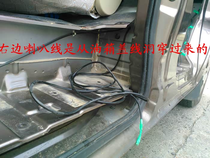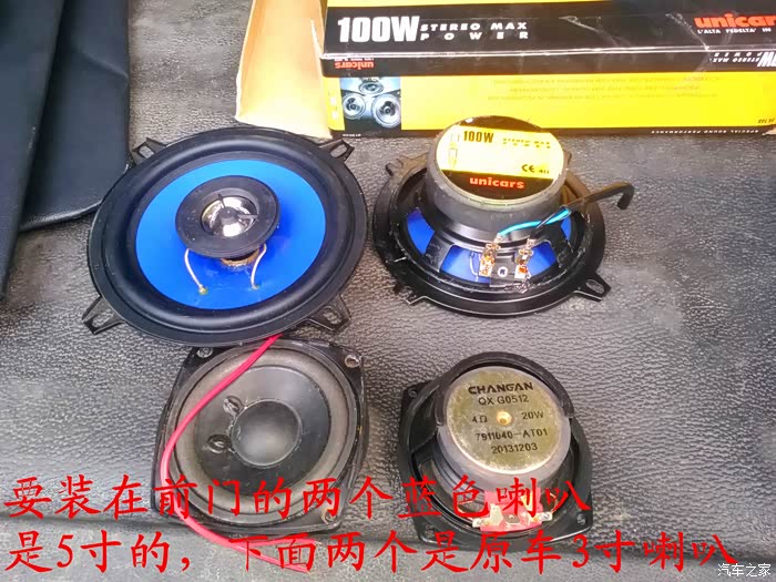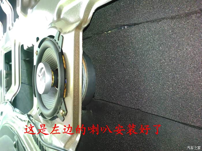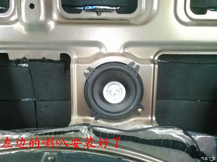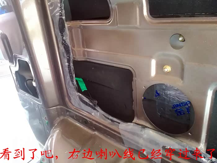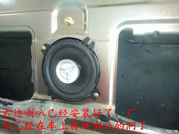 倒车影像试好了,就可以开始准备换喇叭了,前门原车喇叭是3寸的,太小了,后面就更没有喇叭了,长安尼玛的你也太抠门了吧,6-7万元的面包车就配前门两个喇叭,还臭不要脸的把睿行定位成轻客,真不害臊,也不觉得丢人。 前门换成5寸的喇叭,后面换成4寸的喇叭,后面的喇叭线是顺着油箱线一起走的,很简单的,后面安装喇叭的地方洞是厂家生产的时候已经留好了,4寸的喇叭正好能很顺利的安装进去固定4个螺丝,把拆下来的板子在上面画好喇叭位置的圆圈,用美工刀慢慢的把圆圈裁掉,再把皮翻过来用胶带纸贴好就可以了,是不是太简单了,安装好喇叭,开好圆圈,贴好胶带纸后,这时候就可以把板子安装回去了,接着安装好喇叭外面的装饰盖子,4个喇叭就全部安装结束。