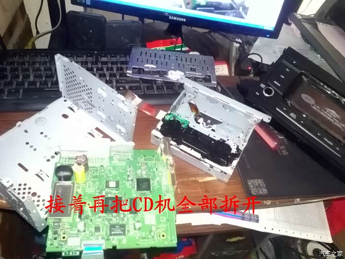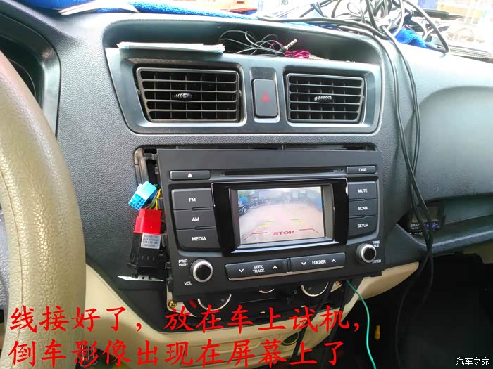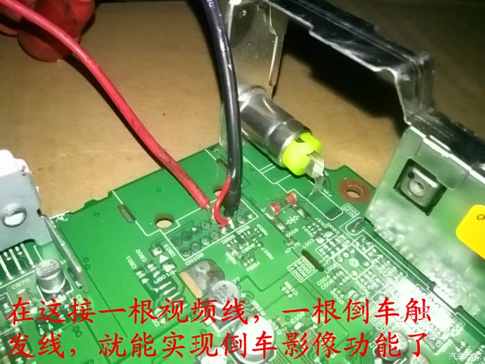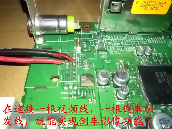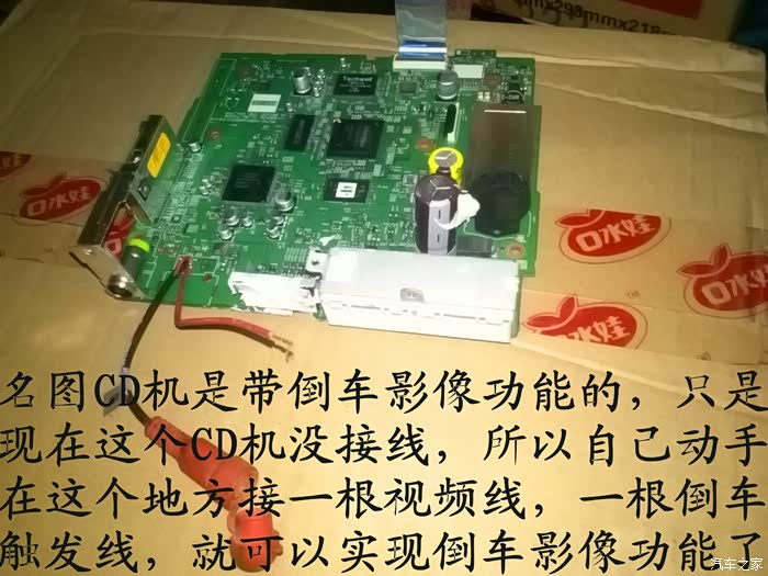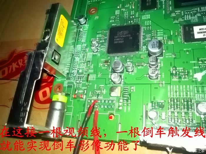 位置都找好后再把CD机全部拆开,因为名图CD机是带倒车影像功能的,只是现在的厂家把这个功能给减配了,没有接这一根线,所以就自己动手在这线路板上面接一根视频线,一根倒车触发线,就可以实现倒车影像功能了,视频线和倒车触发线都接好后把CD放在车上试机,看,车子后面的影像出现在屏幕上了,激动啊!