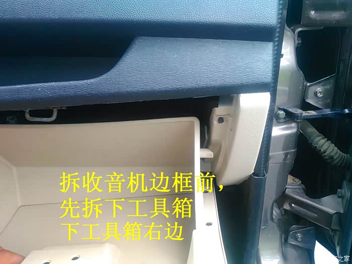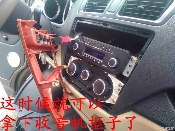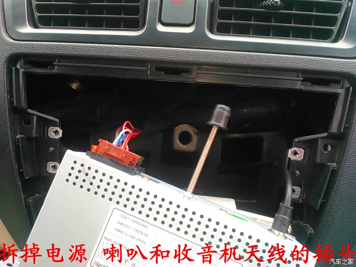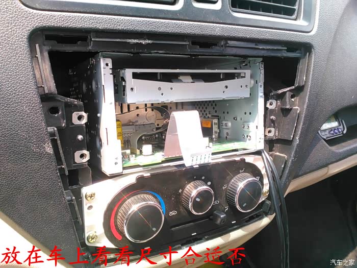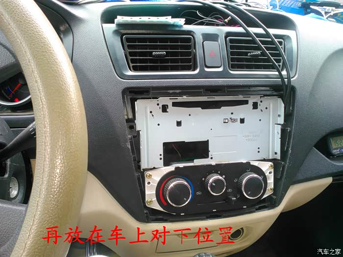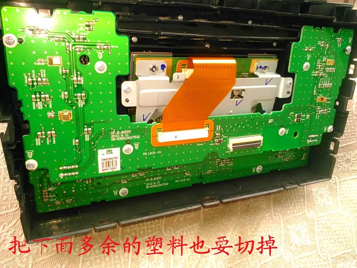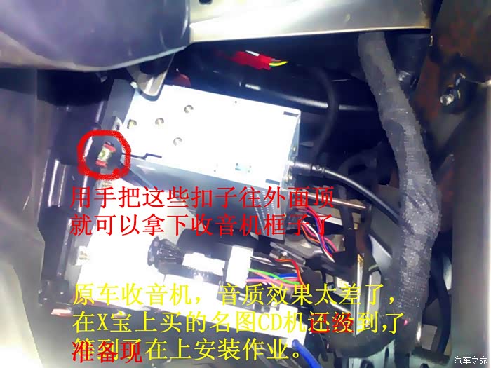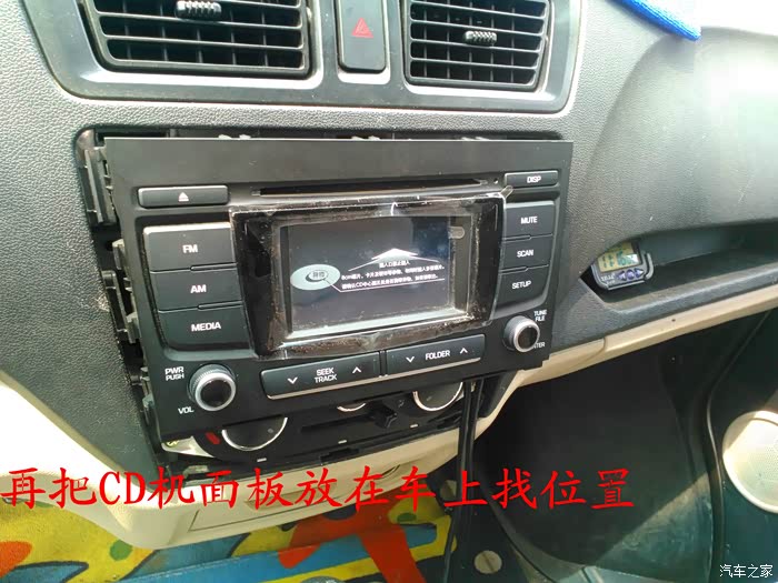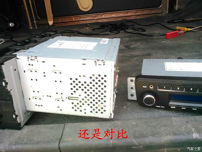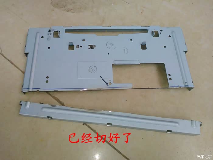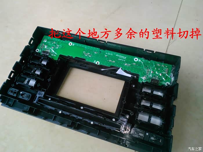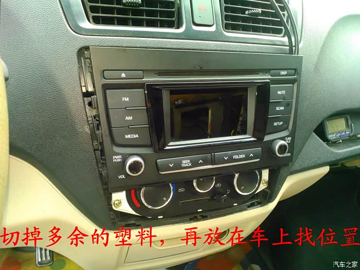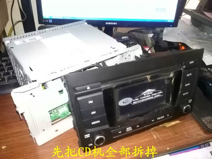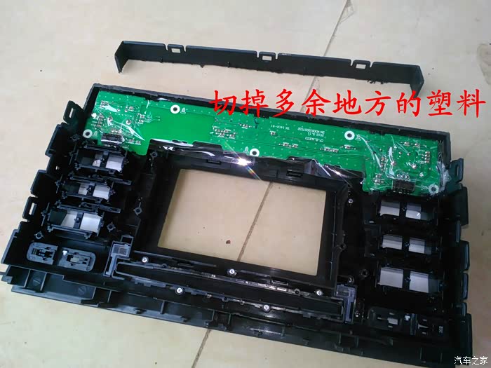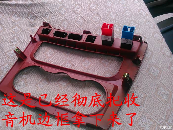 CD机收到后说干就干,在把所有要用到的工具准备好后就开始动手了,首先要拆掉原来收音机的边框,拆收音机边框前先拆下工具箱,把手伸进去到中控台,用手把收音机边框里面的扣子用力往外面顶就可以很轻松地拿下来了,接着拆掉空调,后雾灯的插头,这时候看到原来的收音机了,拆掉4个固定螺丝,拆掉收音机天线插头。 电源插头和喇叭插头就可以把收音机拿下来了,把原来的收音机和名图CD机放在一起对比下,大小厚度都相差太多了,先把CD机全部拆掉,放在车上看看尺寸是否合适,以及找合适的位置,接着把画线的地方用磨光机切掉,CD机面板也要放在车上找位置,也要把下面多余地方的塑料切掉。