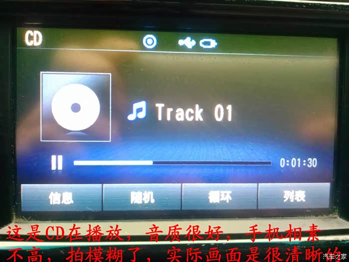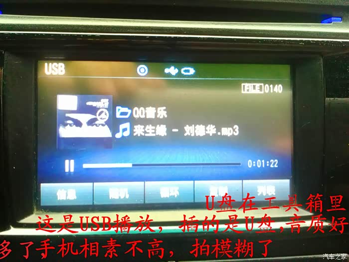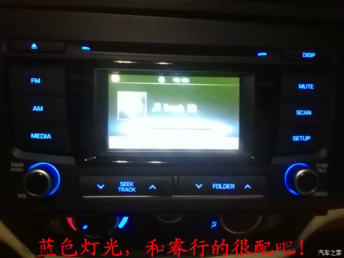 这时候开始试CD机了,这个CD机是可以插U盘的,我把U盘放在工具箱里面的,音质要比原来的好听好多倍,喇叭的声音可以前后左右调节,高音,中音,低音也都可以调节的,我的手机像素不高,屏幕我拍的模糊了,实际上屏幕画面是很清晰的,这个CD机的灯光是蓝色的,发现和睿行的很配,整体效果不错。心里面好激动,现在听音乐音质比原来的好听的太多了,音乐听着比原来的舒服太多了。