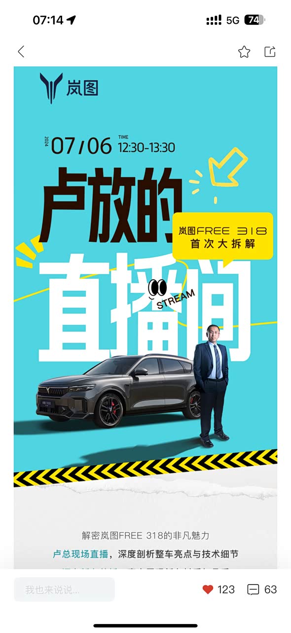 是的你没看错,今天中午12.30分由卢总亲自主持,解密岚图free318的超凡架构与非凡魅力,深度剖析整车亮点与技术细节,作为岚图追光车主的我之所以选择岚图最大的原因之一就是行内领先的整车质量卓越安全性,有这样的机会学习和了解岚图汽车质量与安全结构生产设计的机会我肯定不会错过,下面由我化身为课代表向大家直播讲解;