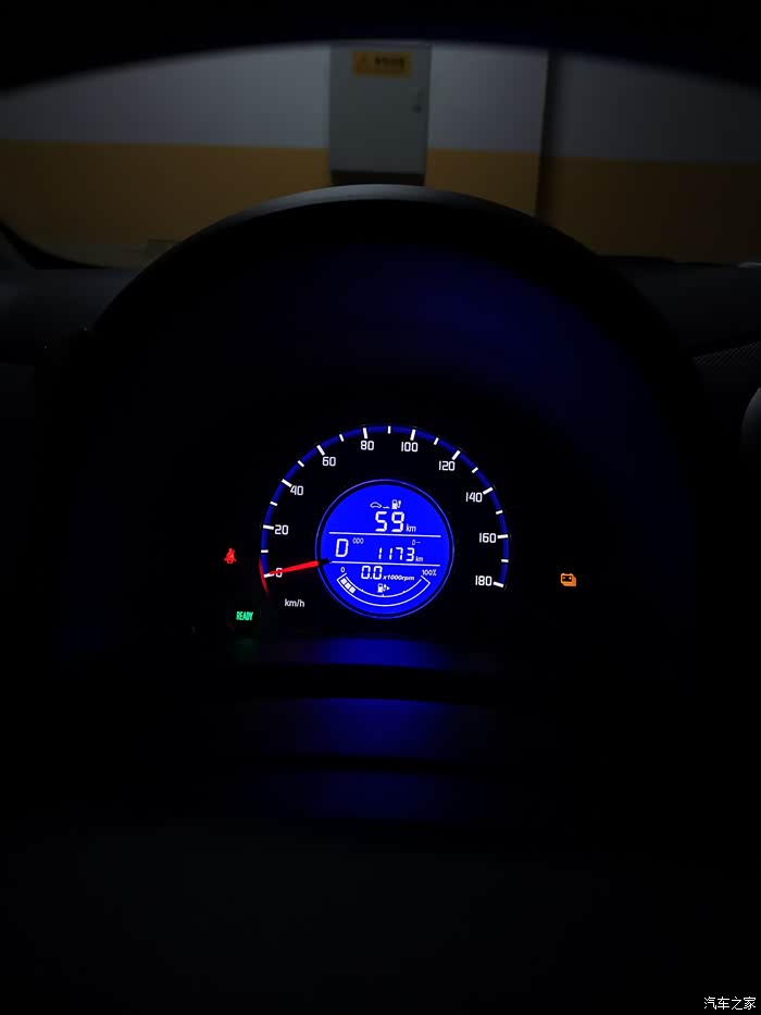 今天开到停车场正好剩余续航59,提示灯亮了。