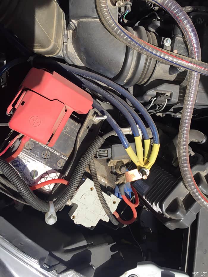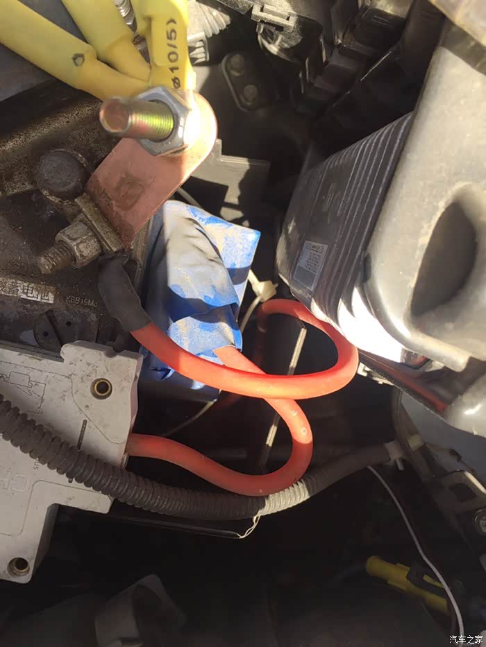 首先,这是地线要回到的地方,电瓶的负极,线很粗,某宝上买的,卖家宣称外皮是带屏蔽的,铜鼻是100A的,也不知道能不能达到,铜片螺丝都是附带的,5条不超100块,还不错哈