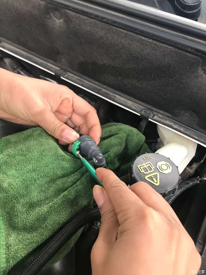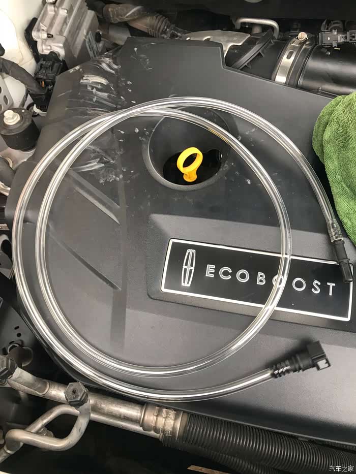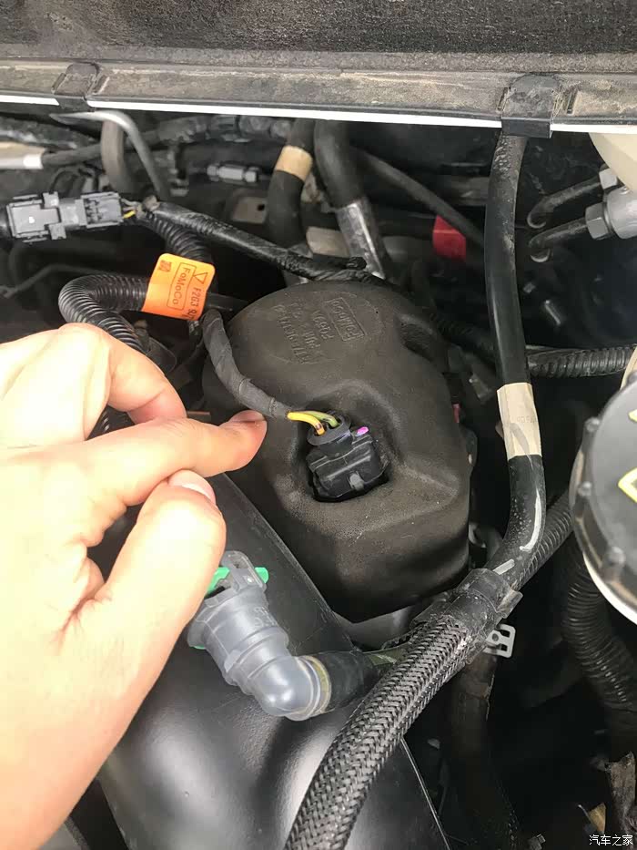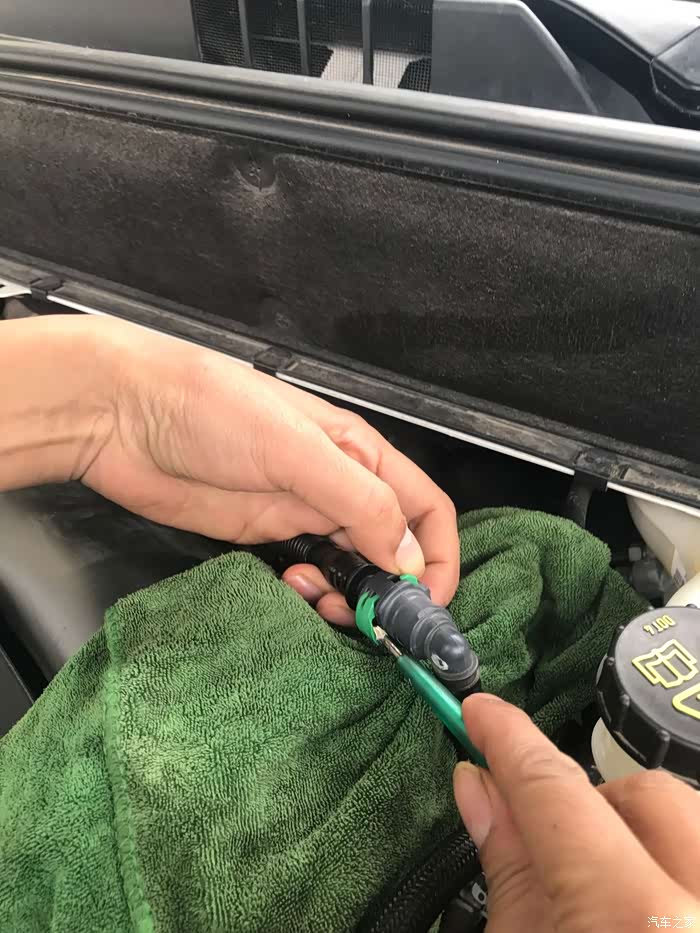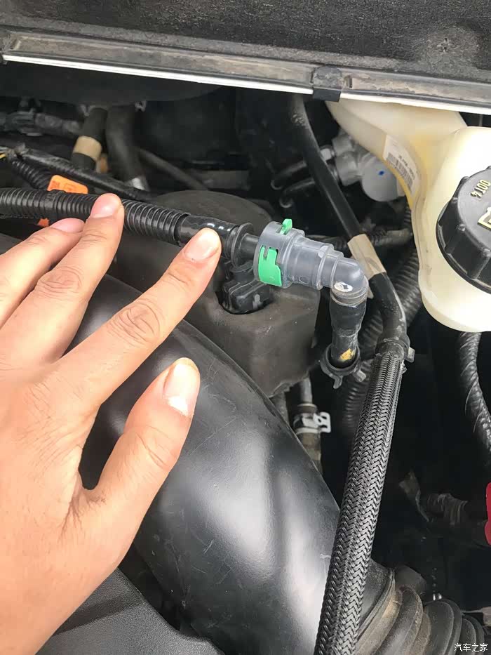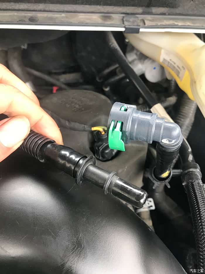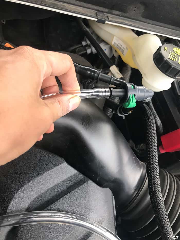 把引擎盖打开,发动机右上角看到这根管子就是汽油泵过来的油管,油压是低压的,在操作前需要确定启动按钮是否在关电状态,如果是通电拔油管时会喷很多油,需要特别注意。