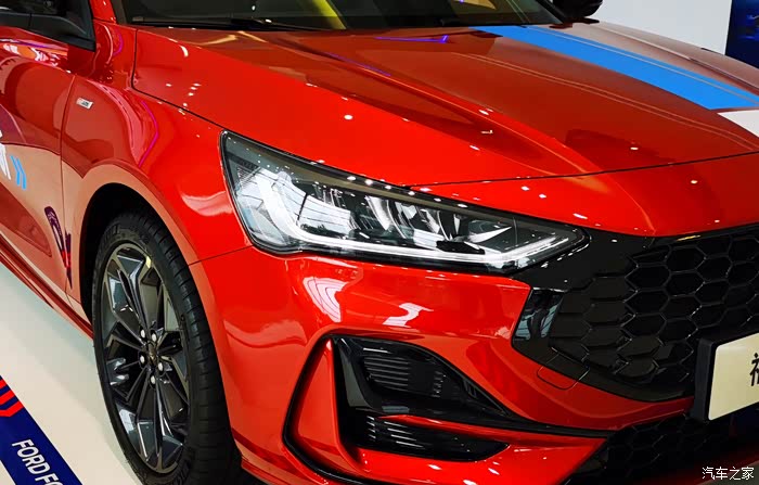 新福克斯的正面,六边形中网内部是熏黑蜂窝状格栅,格栅采用了呼吸式鳞甲设计,具有3D科幻的视觉效果,大灯组向后拉伸,使得前脸看起来更具运动范,整个车正面让人感觉高端大气。