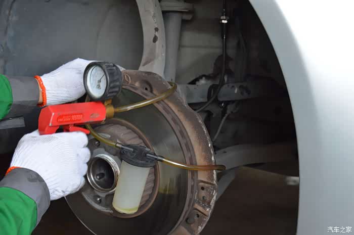 一人在车内踩刹车,一人轮胎位放油,逐一排出卡钳部位的旧油