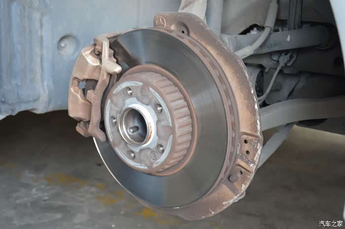 分分钟就卸了轮毂,可以看到刹车盘还很光滑,刹车片还挺厚,还能够跑多一年半载