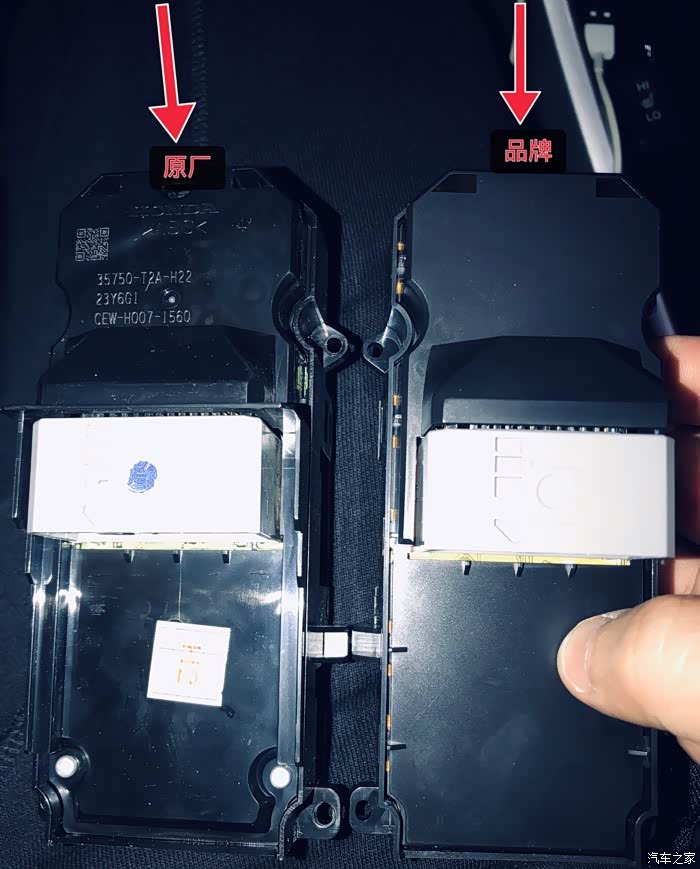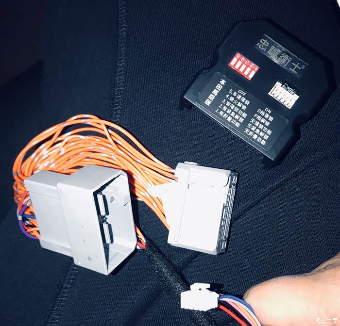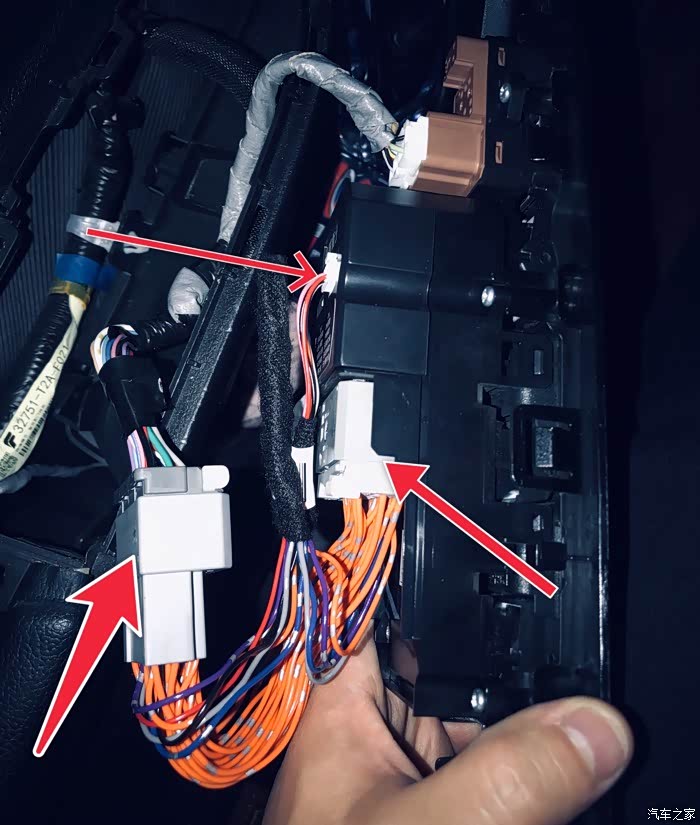 安好以后,把原车插头插进去即可。箭头意思是,插的时候用手推一下白色位置就插进去了。同样不要硬来,否则把插座里的针怼弯了就麻烦了