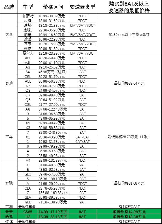 通过上述的比较不难发现,AT由于技术可靠、成本较高,国外的主流品牌都是在25万元以上的车型才使用8AT。哈弗H8和长安的CS85作为中国品牌车型能够在15万级别车型上就开始使用8AT实在是难能可贵。消费者在选择同样价格车型的时候,不妨将两款车与其他车型进行对比。作为3大件中的变速器,花同样的钱,你是不是应该拥有1台8AT的车呢?