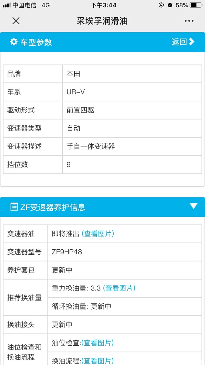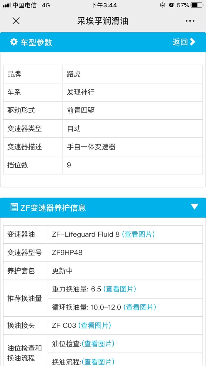 通过采埃孚微信官网发现,采埃孚变速箱8号油适用这款车。经过查询路虎发现神行9AT与URV9AT同款,那就好办了。