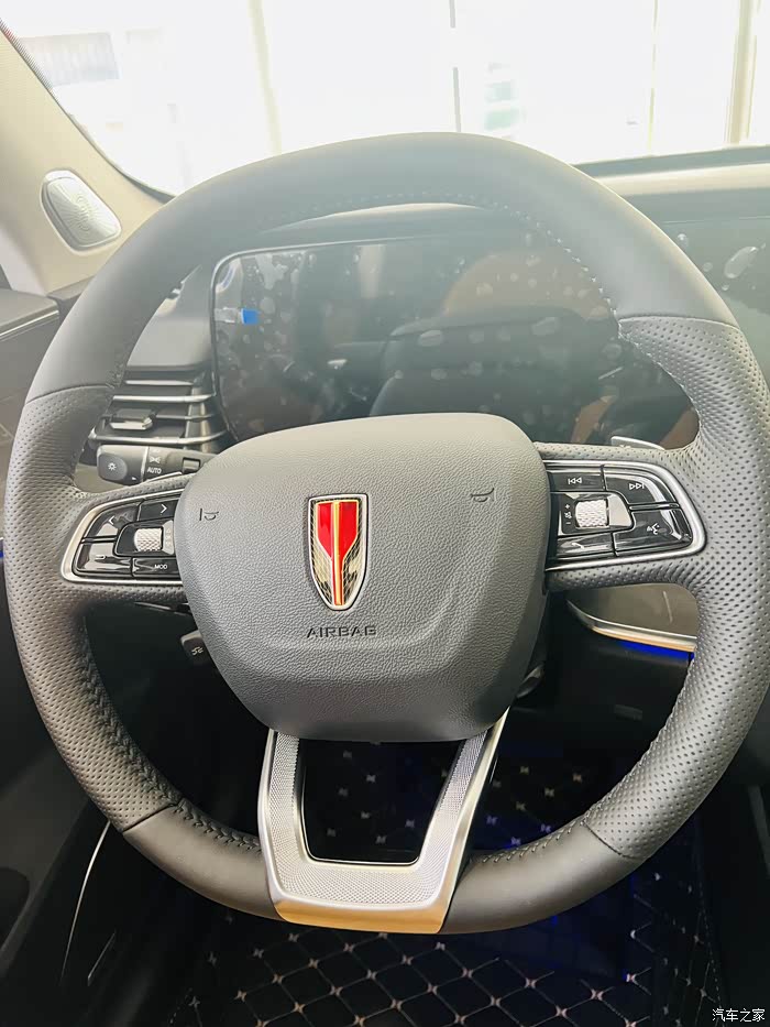 内饰也是很豪华。方向盘的设计好大气,造型也好看,手握的位置还做了打孔设计,想的可真周到呢。