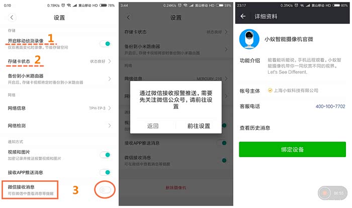 3、很重要的一个选项:关注小蚁智能摄像机官方微信,绑定摄像机之后,就可以通过微信收到侦测报警信息。敲黑板:该功能免费。