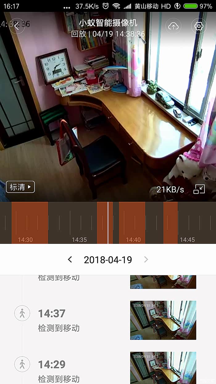 实时监控(直播)的状态下,点击屏幕会自动跳出时间线,可以左右拖动,查看记录的视频,这些视频分移动侦测和宝宝哭声侦测,都会记录下来,向APP和微信推送报警信息,同时提供6秒钟的视频预览。