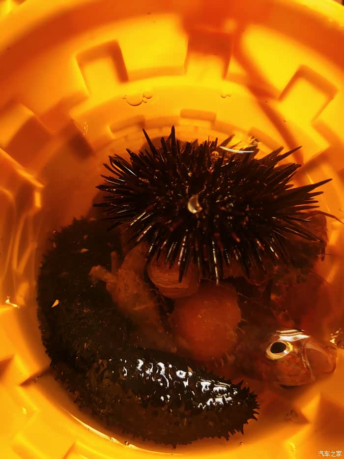 我们的收获,一只海胆,一条海参,一条小鱼,水母、小虾、螃蟹......