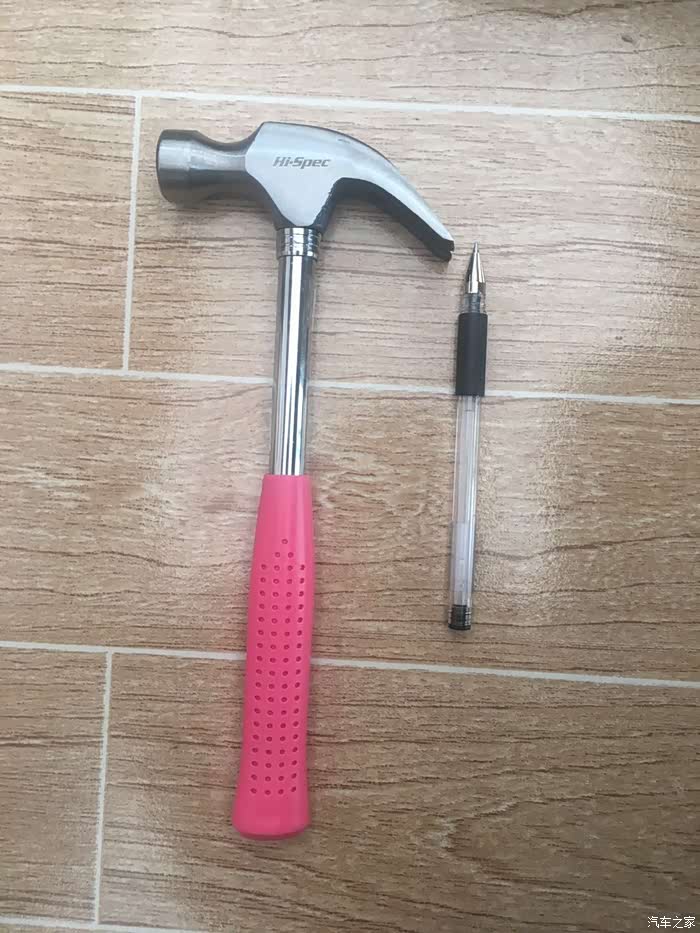 粉色硬塑料手柄铁鎯头一只,学名羊角锤,金属锤头表面粗糙感隐约可见。