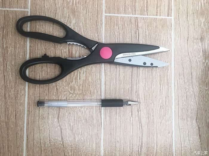 家用剪刀1枚(长度200mm),印着不锈钢英文标识,使用起来咬合度略紧,锋利度尚可。