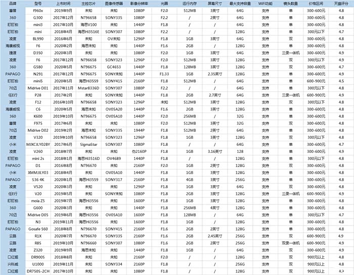 记录仪选择300-600元这价格区间偏向大众化,可以选择的品牌款式也比较多,主要品牌有360、盯盯拍、凌度、趴趴狗等等,款式比较多就不一一列举出来了,可以直接看下图,这价格区间的推荐趴趴狗S36 4K跟凌度V260。