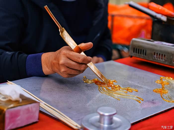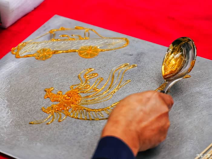这次师傅介绍了糖画的发展,现场创作了多幅作品,当属沃尔沃标志最具代表性,