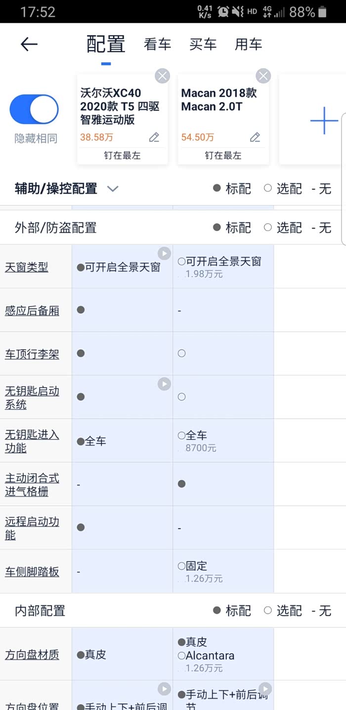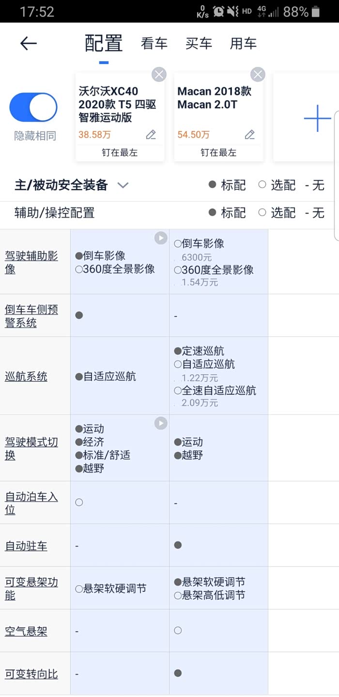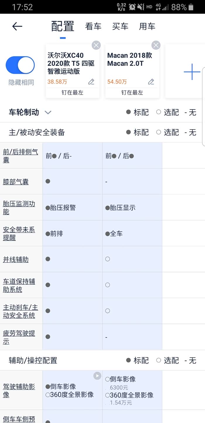 最后是配置,40是完胜,macan膝部气囊,并线辅助,车道保持,自动巡航,远程管家等等安全配置全都没有,这样的车怎么能开上路,另外像倒车影像,舒适进入,感应后备箱等能体现出豪华感的配置macan也一律没有。