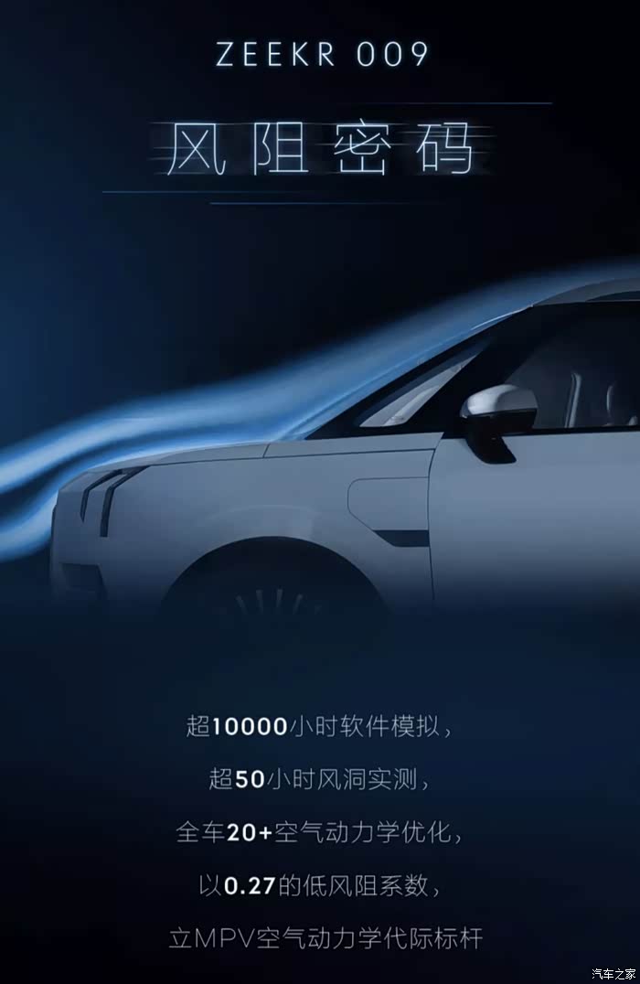 极氪009官方做过一个专业测试,风阻密码:0.27。