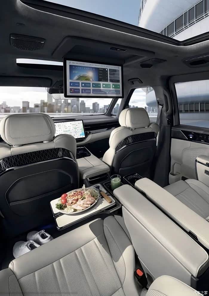内饰门板上竟然还有触摸式控制按钮,可以控制后排空调,设置窗户情况等功能,像遮阳帘,后排小桌板、按摩、通风等等,这些就更加不必说了,到处都是科技感。