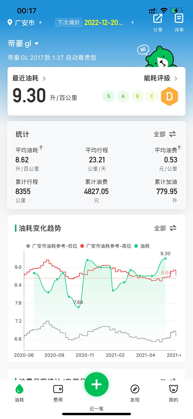 这车的油耗一箱油大概在600多公里的样子,以前的油价一公里在5毛多一点,现在的油价估计要6毛。