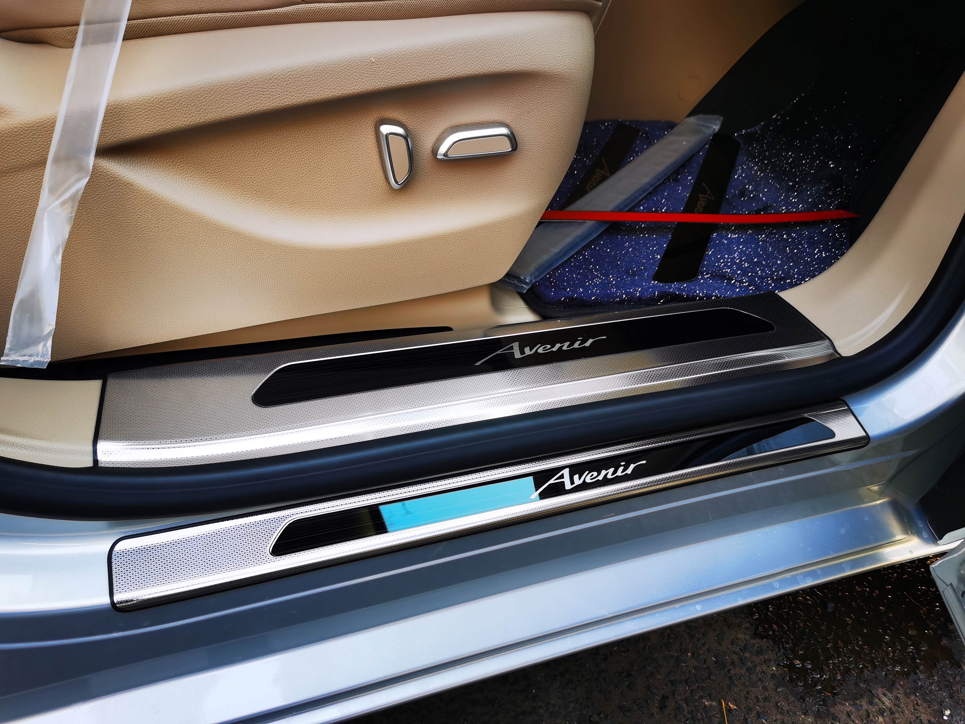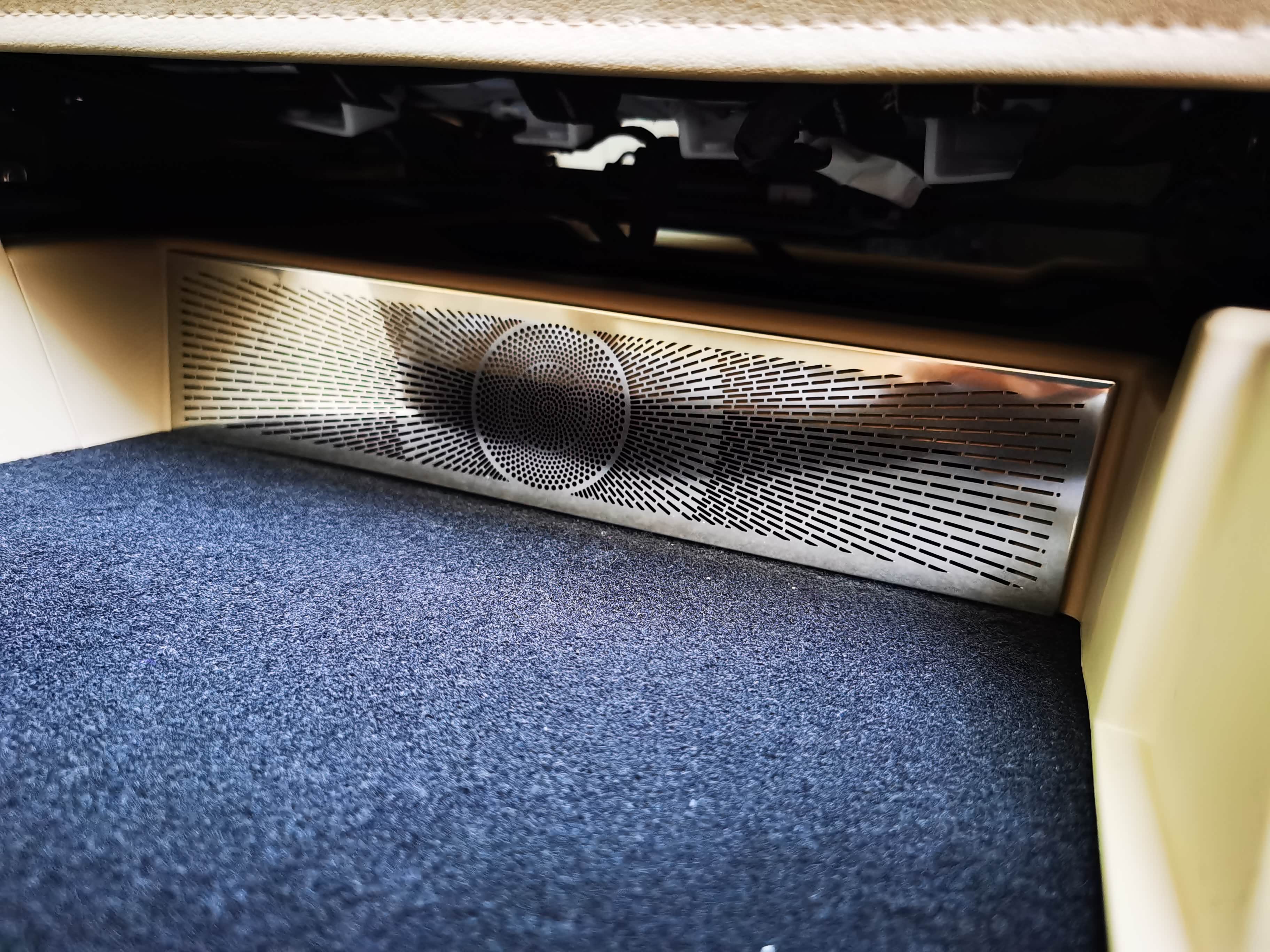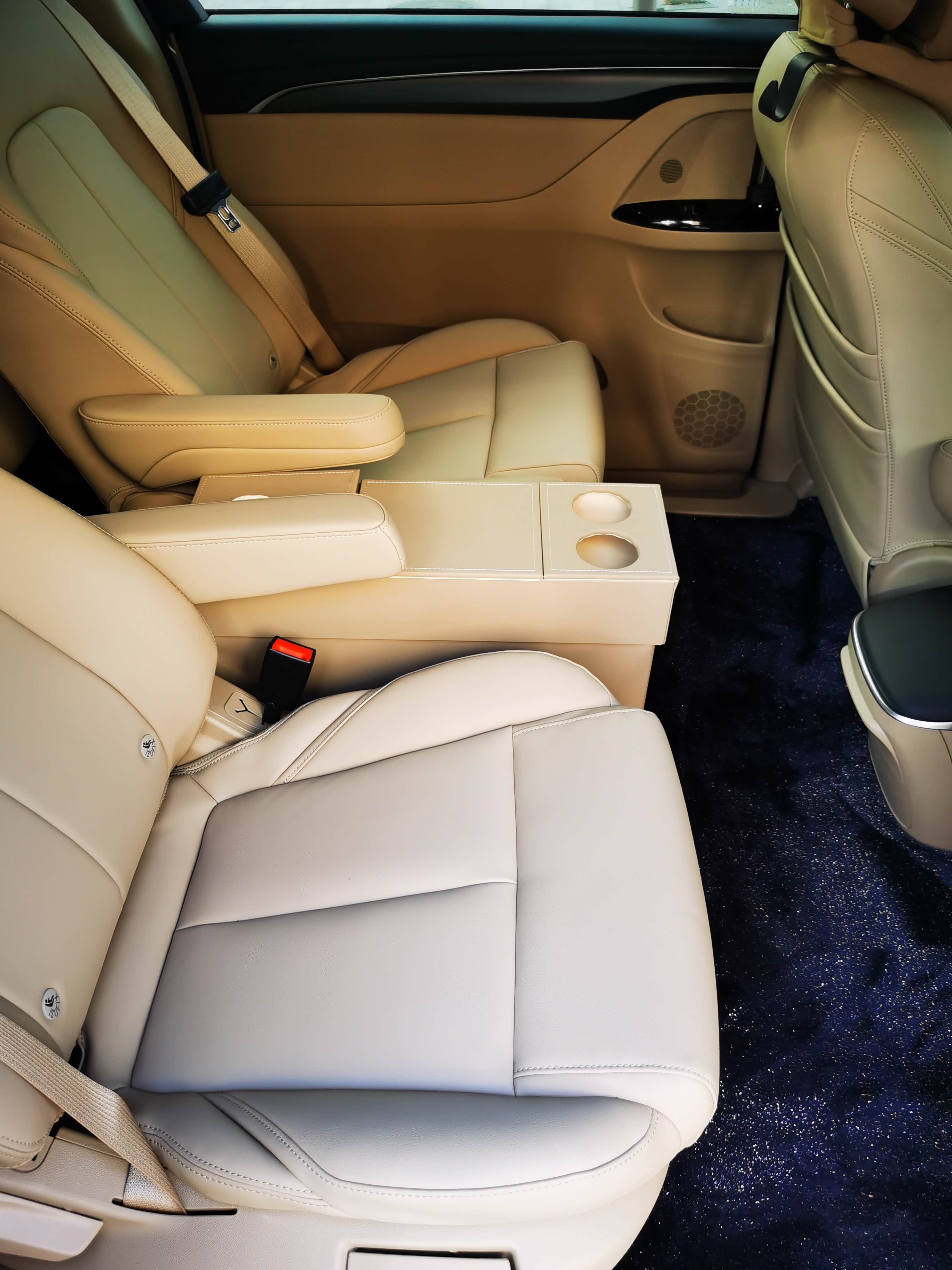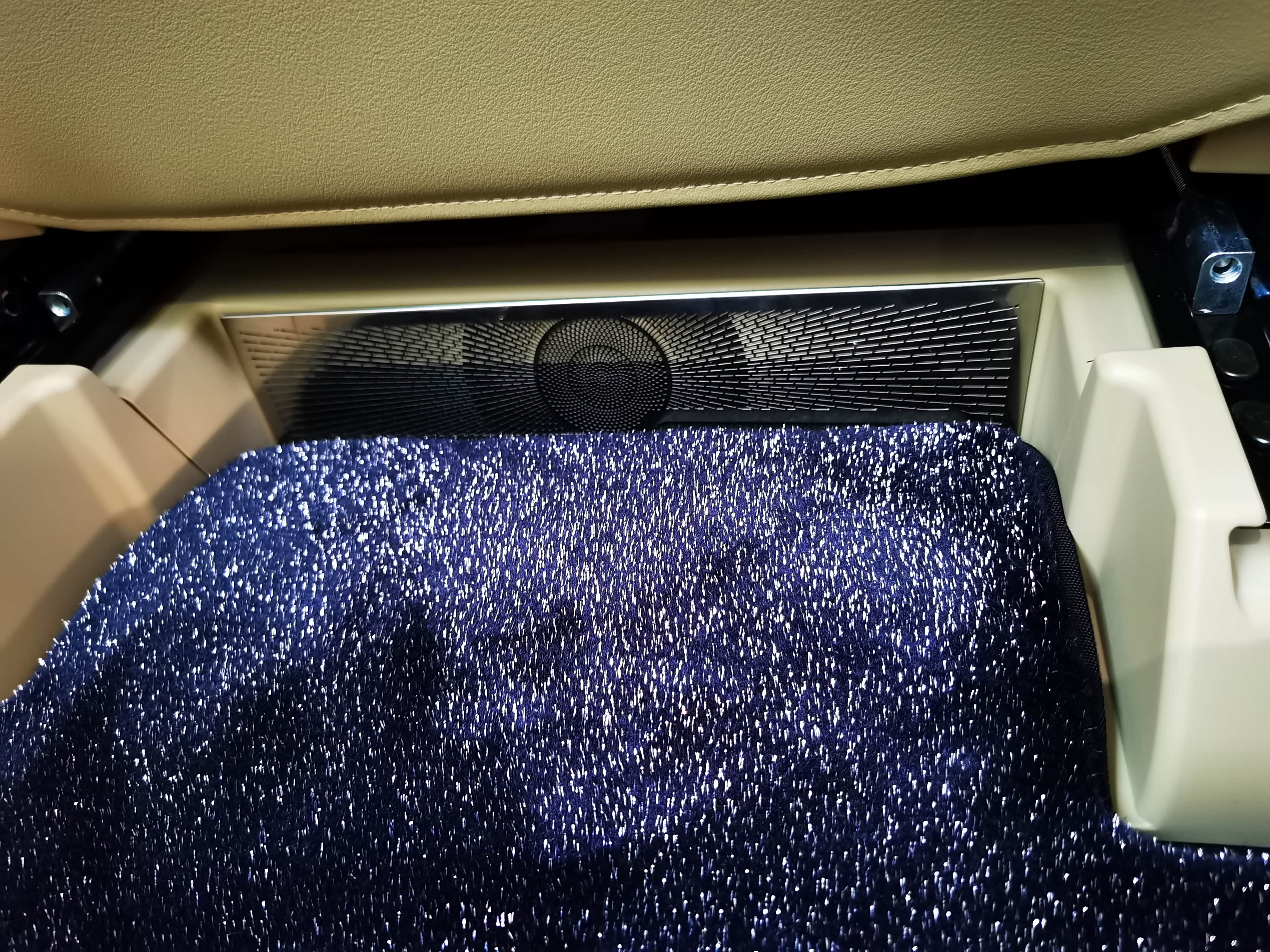 空调口挡板贴上配合星空地毯效果看着还不错~~另外还发现三排座椅底下也空着,可以放不少东东~但仅限于扁扁的东西~~暂时我放了个简易的小桌板在三排座椅下面,基本是停车时才会使用