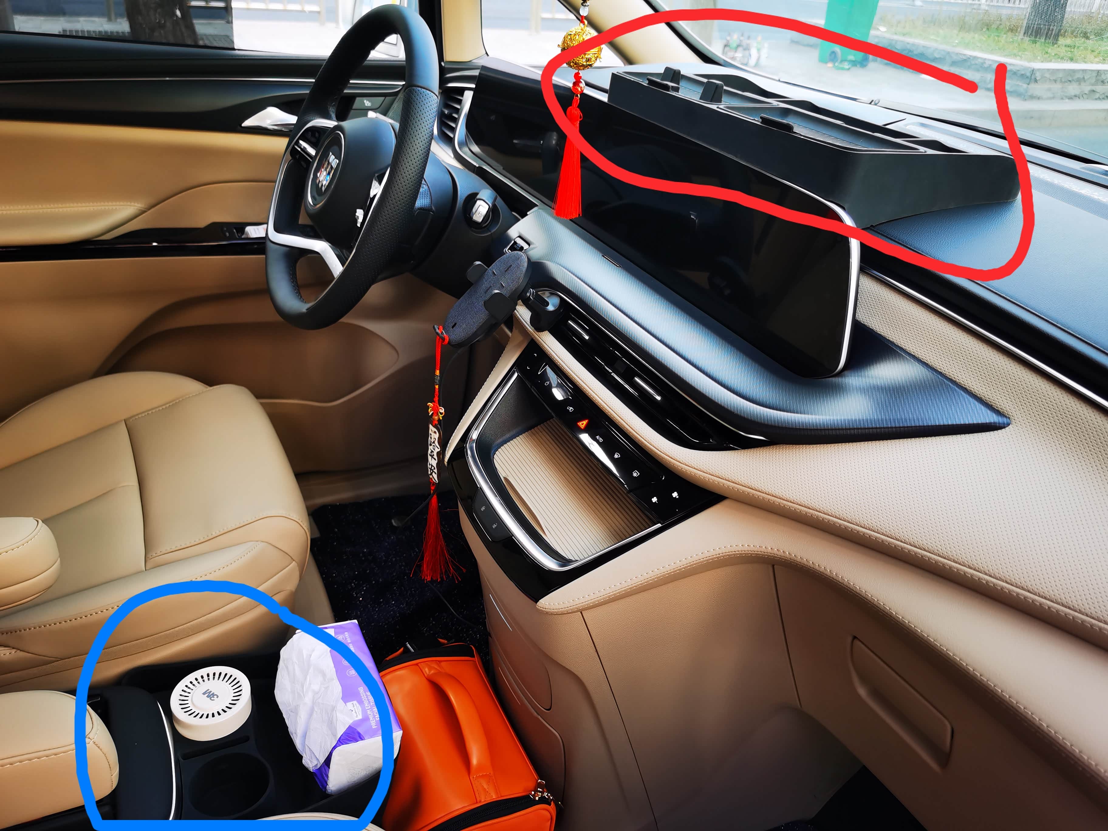 红圈这个不太推荐,不便宜 也没啥用,但买都买了,也懒得退了~放点零碎当个分格槽用吧~手机支架后来还是用的老车无线充电的~扶手箱我不准备改,因为这样矮点方便有需要时跨到二排~~且我觉着前排座椅单独扶手挺舒服的~~所以扶手箱的储物空间就小了点~~蓝圈这个扩展格可以考虑买,不影响主驾走到副驾,也方便放手机水瓶啥的,暂时放了纸抽和3M吸甲醛盒~对了~这车是有新车味的,还不怎么小~也不知道是不是我买的东西有味。。。但我感觉车本身的也不小~~