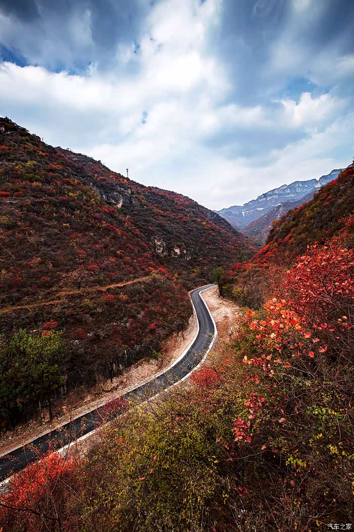 山路曲曲折折,路两侧的山坡上,植被茂密,在秋天来临时候呈现出耀目的颜色,以红色为主,红色、黄色、橙色、绿色交错着铺满山坡,非常漂亮。