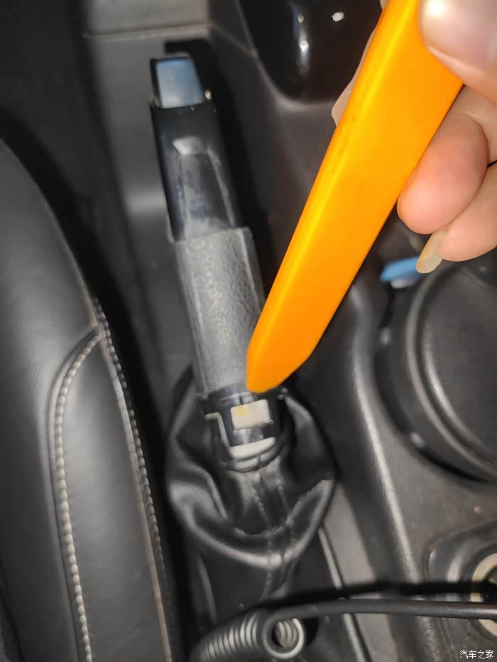 注:此方法不用拆手刹底座,就是中间一点稍微有点难度,但是可以选择跳过。。开始用塑料撬棒挑开手刹皮套,然后撬开皮套下这个卡扣。
