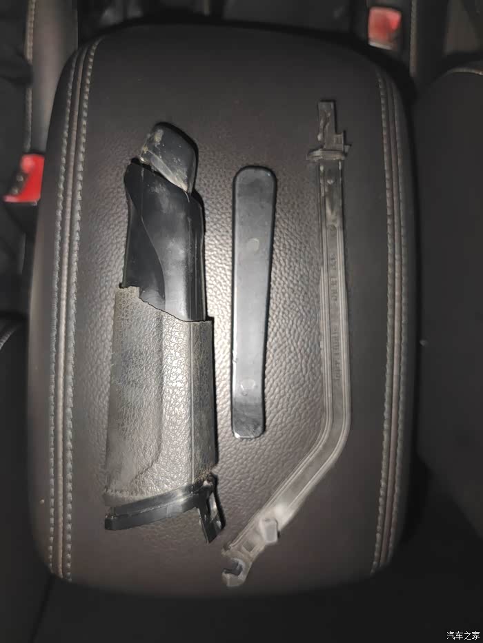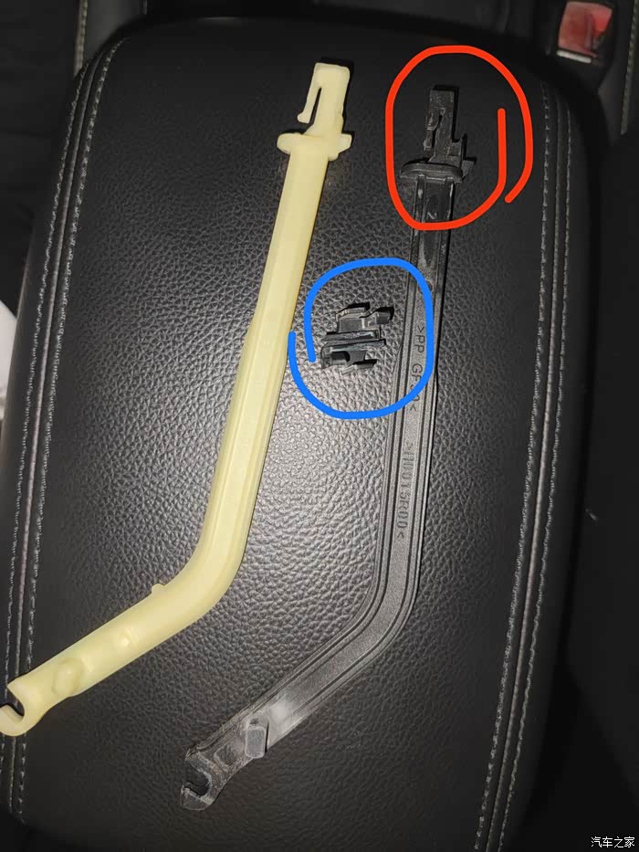 这就拆出来的手刹手柄,和塑料配件,中间是撬棒无视。还有个塑料配件这里没拍进去,↓(下图蓝圈,不要弄丢)