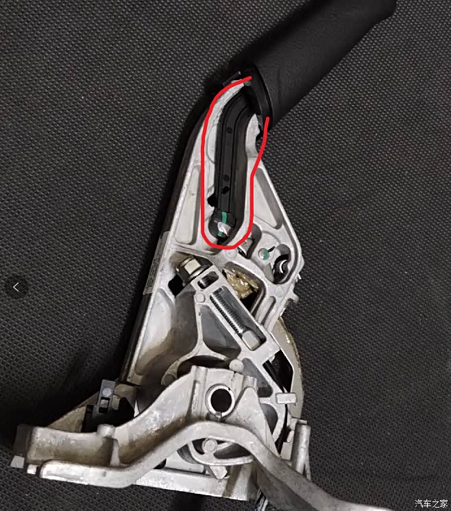 上面蓝圈的小配件不要弄丢了,是装这里起固定作用的,要不然底部的卡口会有脱出的风险导致手刹无法解锁,装好这个配件后首先试一下手刹解锁是否顺畅。