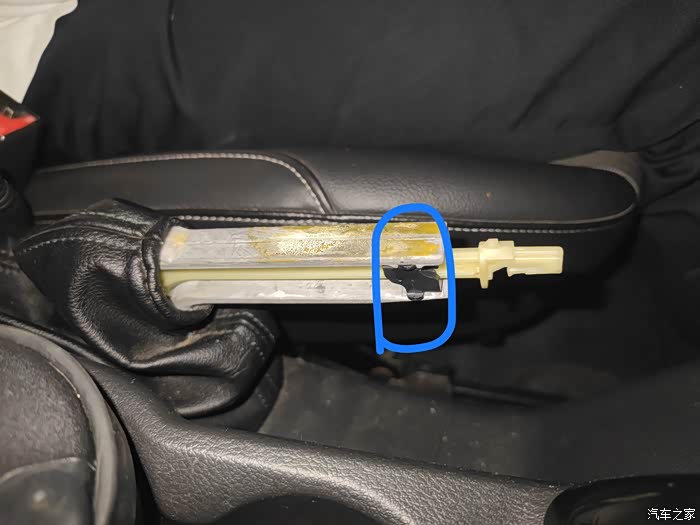 接着握住手柄往车头方向用力,很轻松就能带着手刹键帽拽出来,可以看到原厂手刹是有点胶的(黄黄的污渍),我的时间长了老化变脆了,如果拽不出来可以左右拧一下。