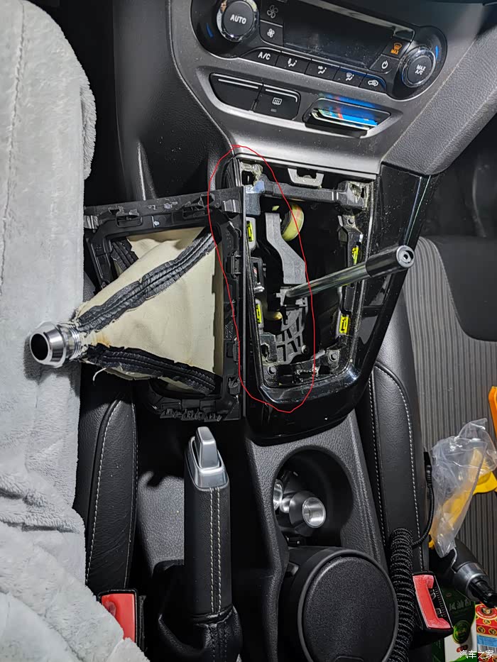 首先是拆面板,因为我的面板是后换的很容易就拆下来了,基本无损,拆断一两个卡扣不影响使用~从左侧侧面开始撬,尽量不要使用蛮力,然后逆时针将排档头转下来,(拆完了才想起做个记录··)