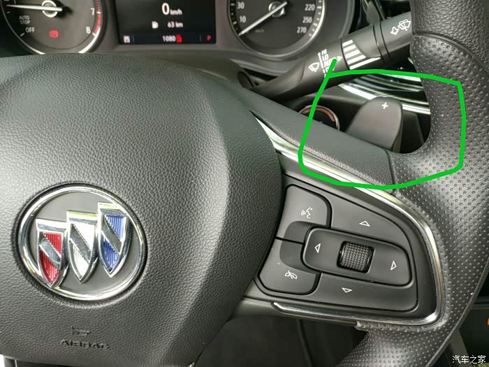 多功能方向盘左边的定速巡航以及绿色框线内手动模式的“-”档键。
