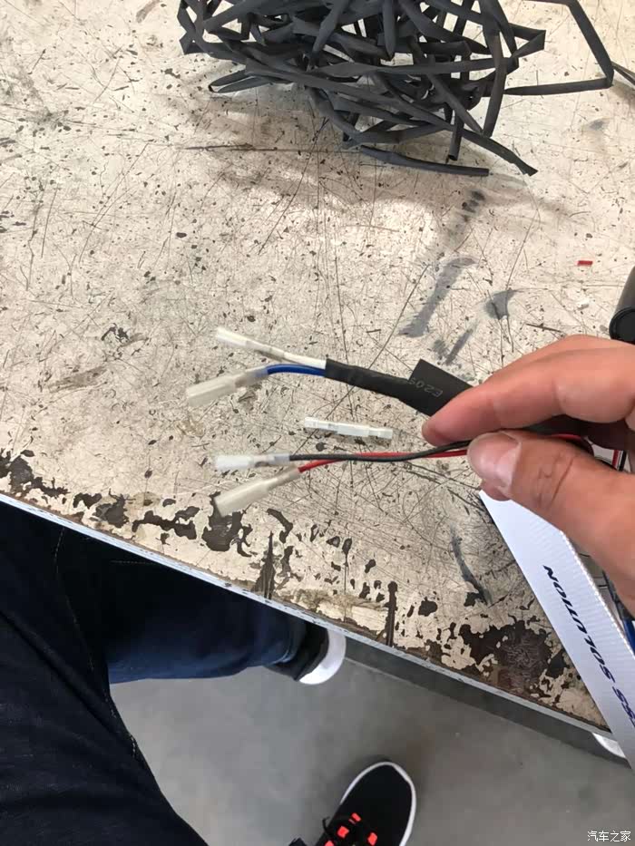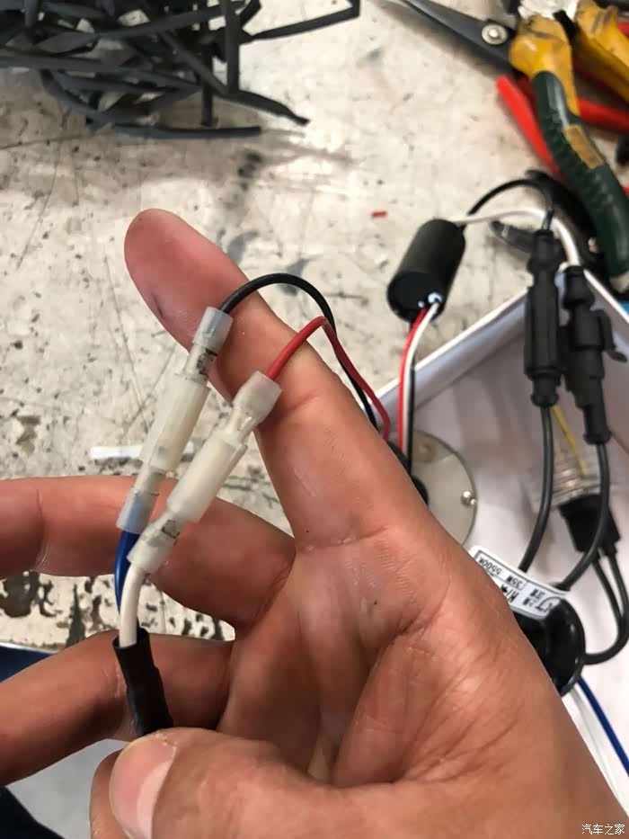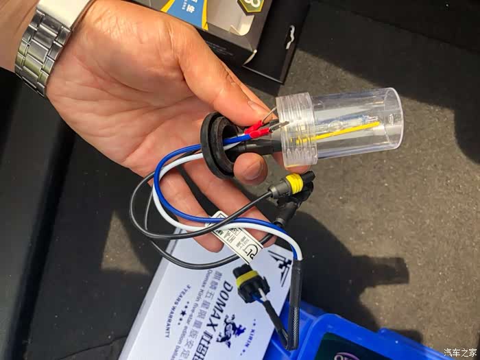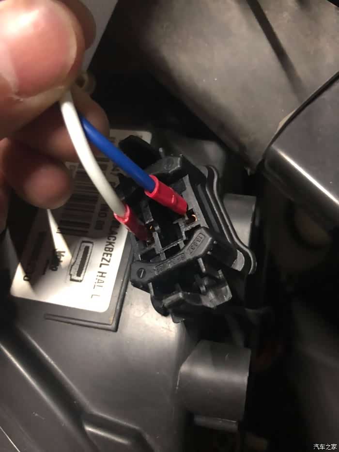 将氙气的电源线插入到原车灯座上(此处大家要注意,要跟之前和安定接线对应起来,要不然灯是不亮的:安定的线是红和黑,氙气的线是蓝和白,一定要记得哪根颜色和安定的红线接,然后把它查到灯座正极上哦