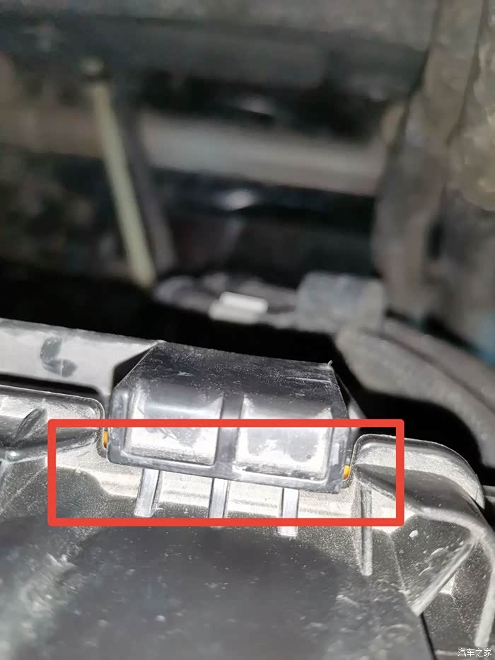 )。空调滤芯的更换教程以前发过,这次直接发空气滤芯。怎么找到空气滤芯的位置送的用户手册上有,仔细找找看,上面还有告诉怎么拆,直接按照上面的方法用点力气能搞下来,下面只说怎么安装回去。卡扣如下图,安装回去以后检查一下,是否卡上去,可以用手机打开闪光灯拍照查看。前面自己怎么都卡不上,后面发现必须要把整个盖子卸下来才行,下面主要将卸的教程。