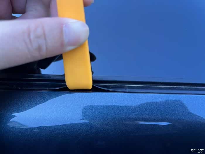 卡扣扣进去以后就把竖杆拿上来比对,这是前面,要和车顶的漆面持平