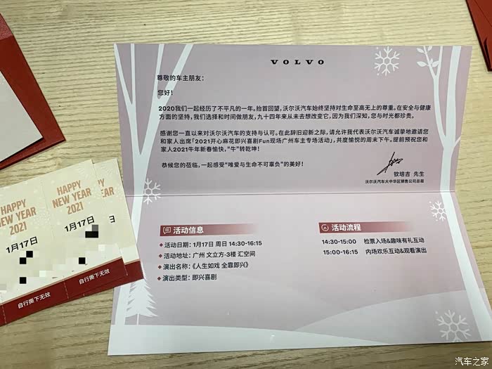 在通过沃尔沃汽车中国车友俱乐部了解到有送票的福利,很开心跟家人一起参加了官方车友俱乐部和开心麻花的活动。精神与质量双向奔赴,让生活更有色彩。