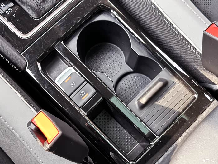 前排中央扶手前端是两个杯架,杯架左侧是一个小的储物格,可以放手机和通行卡之类的,储物格前方是电子手刹和自动驻车。