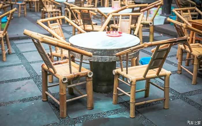 走进鹤鸣茶馆,屋内有一对黑漆柱子,上面刻有这么一对烫金对联:“四大皆空坐片刻不分你我,两头是路吃一盏各走东西。” 茶社很大,竹椅木桌错落有致,高搭的凉棚下挂几方鸟笼,根雕的茶台四方配以竹木椅子,周边小溪竹林相依相绕,别有一番清幽雅致~