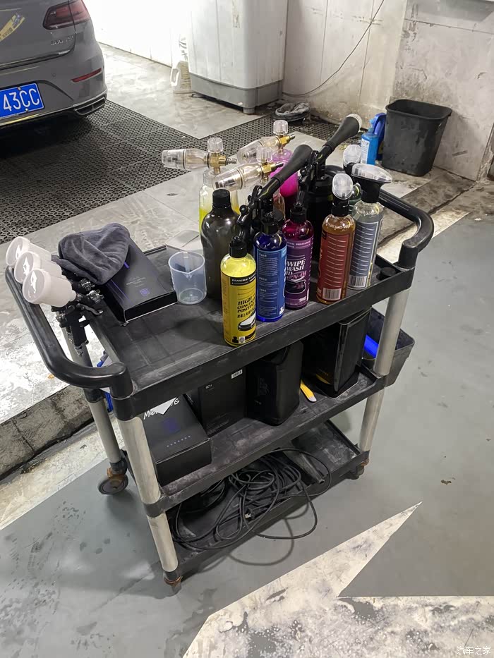 在师傅冲洗的同时,我看到了一推车的洗车液,很齐全,从轮胎清洗剂到内饰清洗剂一应俱全。全车打湿后,师傅开始正式的清洗工作。他首先把洗车液和水按1:10的比例稀释,然后用PA壶均匀地喷满车身,使泥沙软化。等待两分钟后,从下往上冲水,避免洗车液被上面的水流稀释,影响清洁效果。