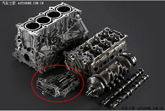 J24B引擎拆解图,同样可以看清其全铝的材质,并有缸套的设计,缸套则采用铸铁材质,为凯泽西的可靠性和耐用性添砖加瓦。红圈部分为J24B的反向平衡轴机构,通过带动一个和曲轴反向旋转的平衡轴,能有效减低发动机运行中产生的震动,这也是J24B运行起来感觉平顺的原因之一。